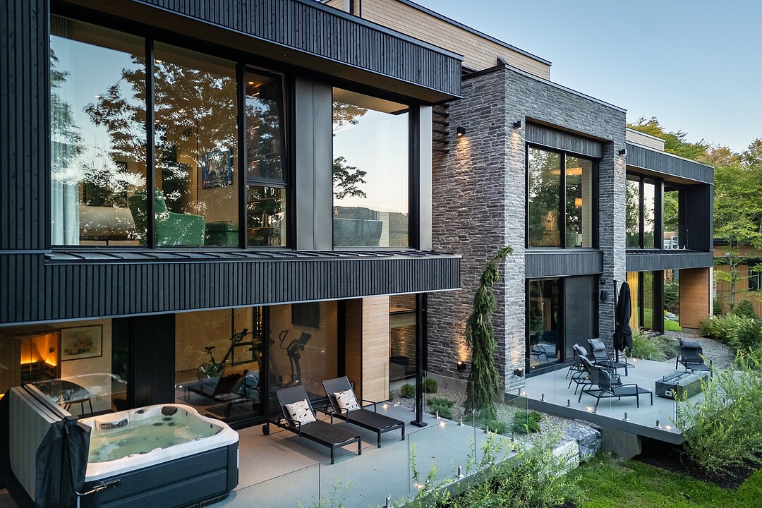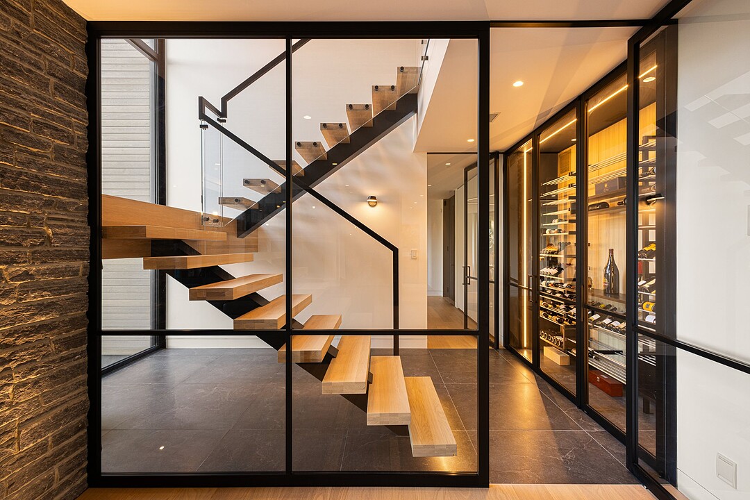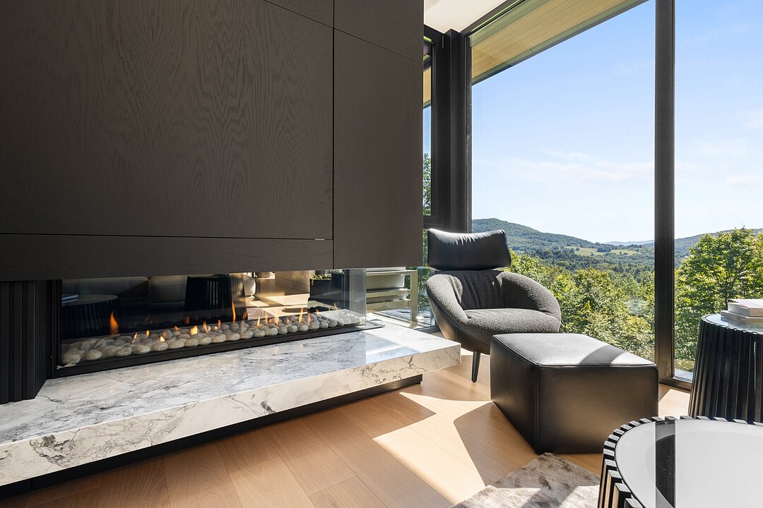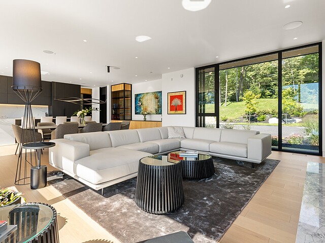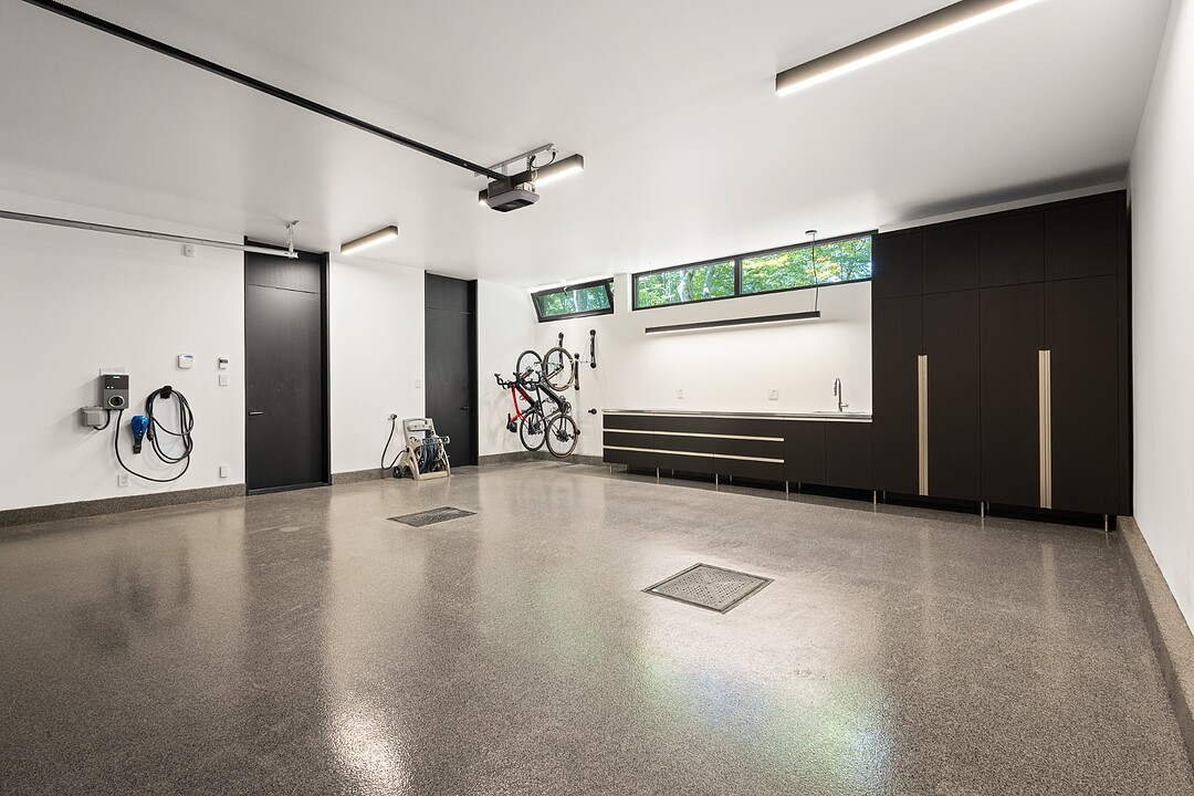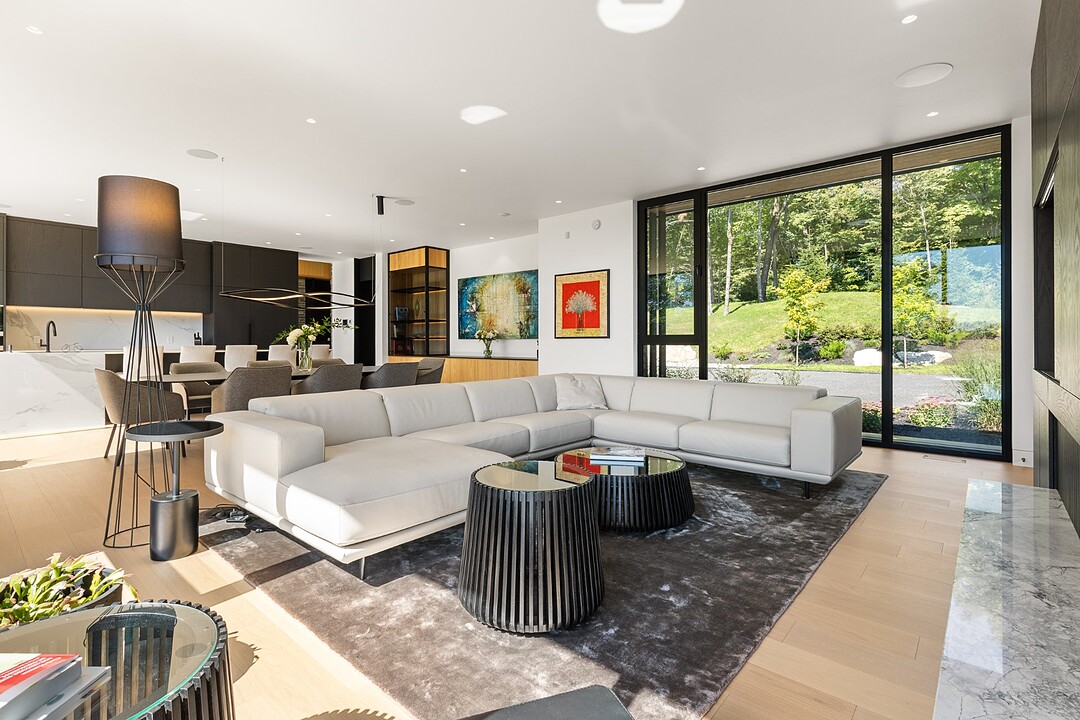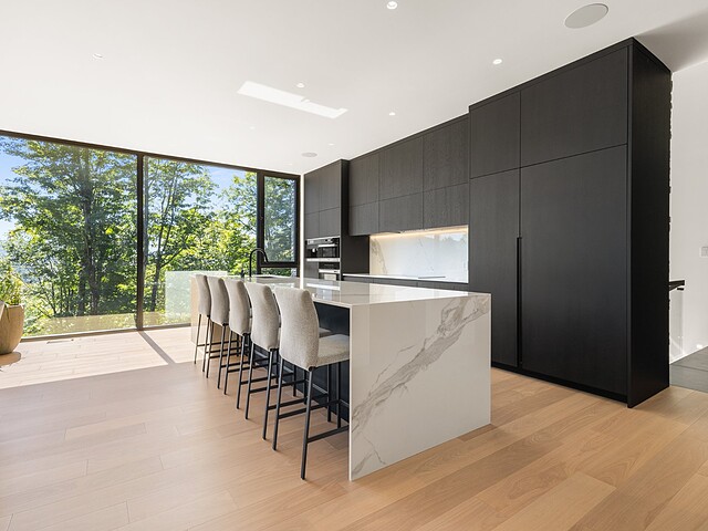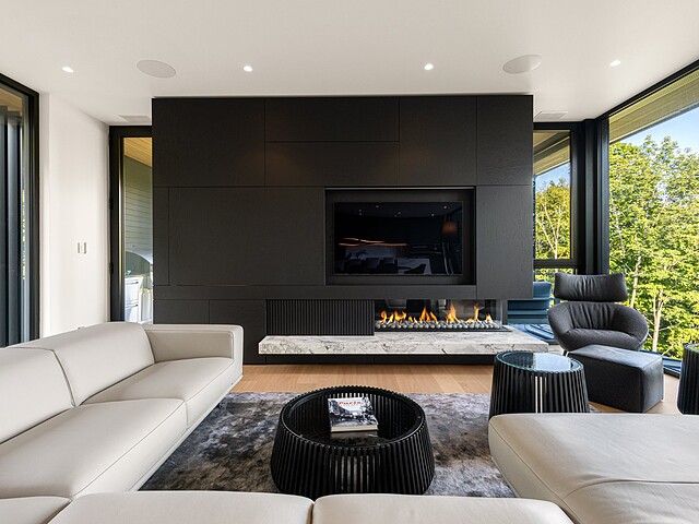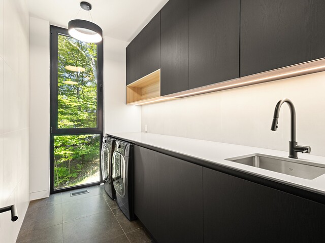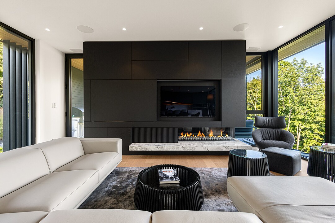 **High-end materials** - Flooring: White oak & ceramic - Countertops: Neolith - Windows: Shalwin - Exterior siding: Knot-free cedar by Atelier Bois David Gilbert - Garage floor: Polyaspartic - Fireplace mantel: Marble by Ceragres - Heated floors