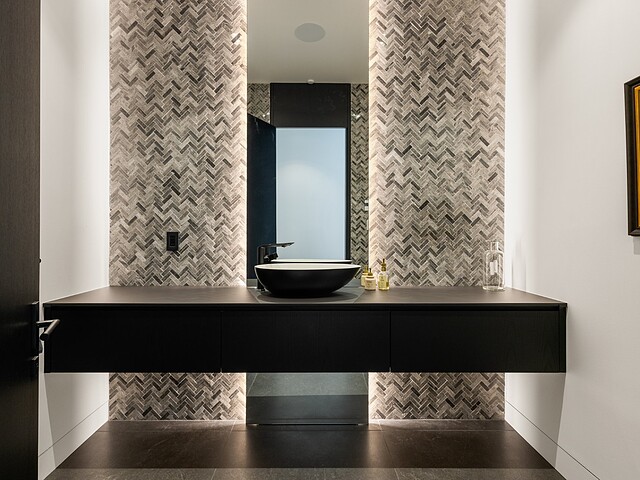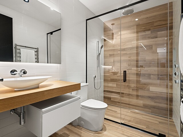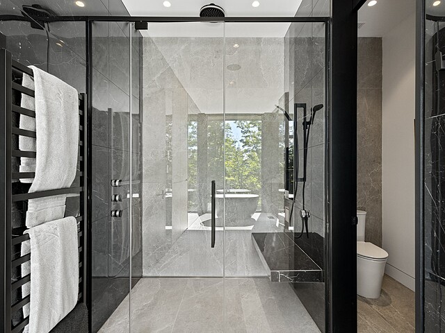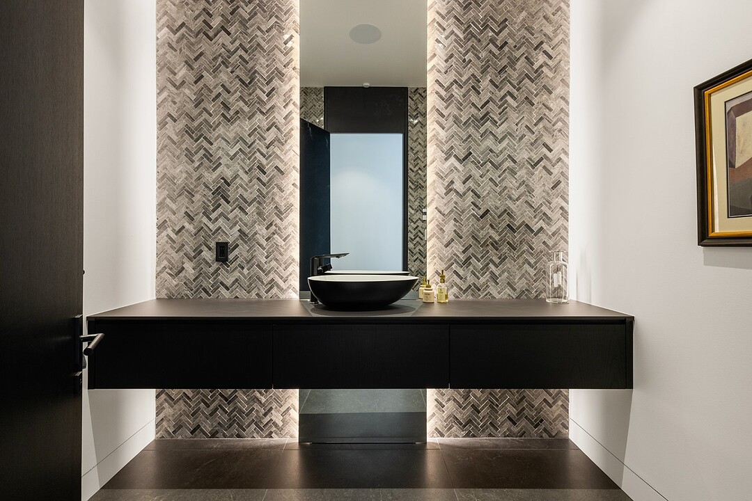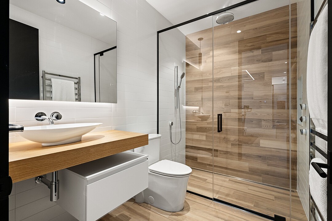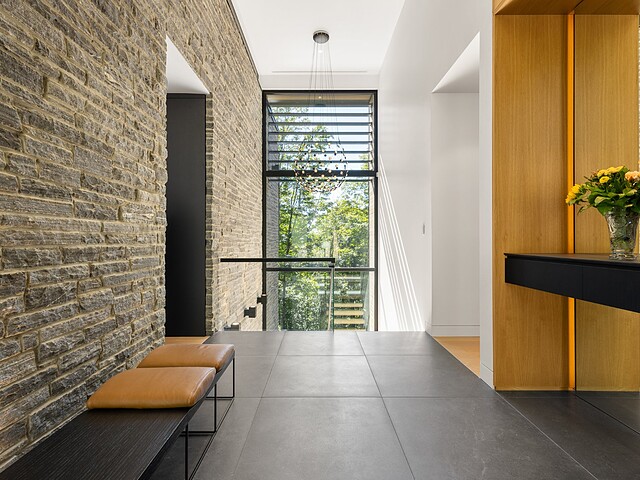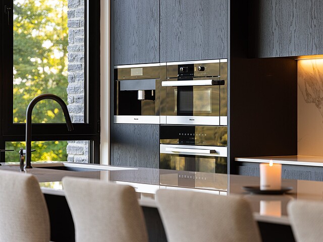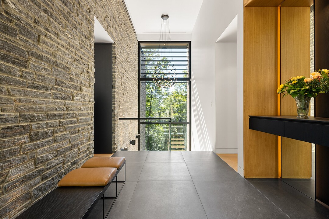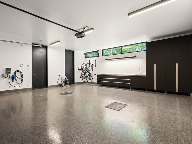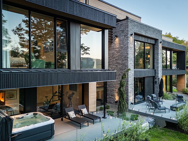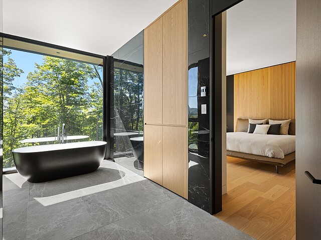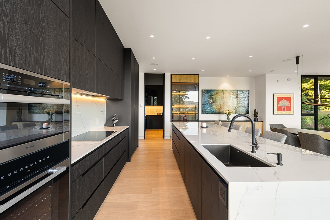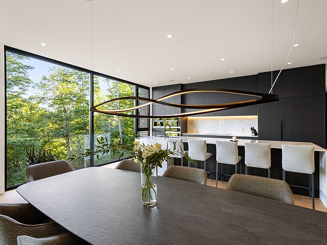 **High-end materials** - Flooring: White oak & ceramic - Countertops: Neolith - Windows: Shalwin - Exterior siding: Knot-free cedar by Atelier Bois David Gilbert - Garage floor: Polyaspartic - Fireplace mantel: Marble by Ceragres - Heated floors