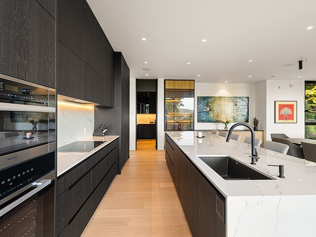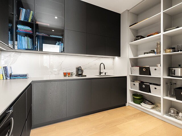 The oversized dream kitchen includes a spacious dining area, high-end appliances, a central island with a Neolith countertop and waterfall edge, as well as a large pantry with a sink and integrated cabinetry.