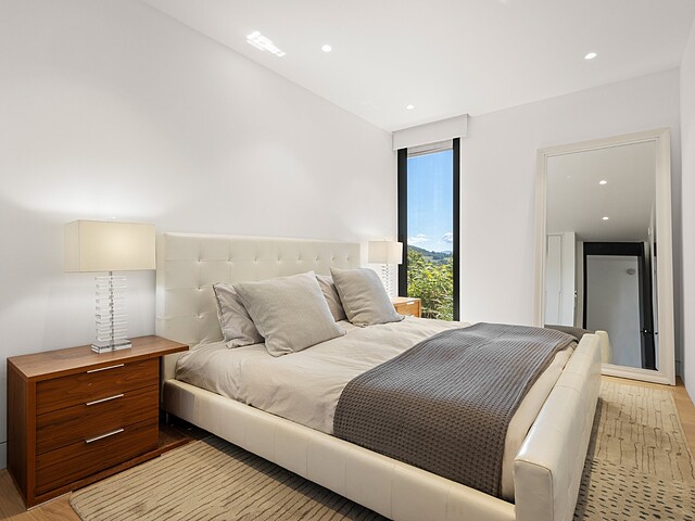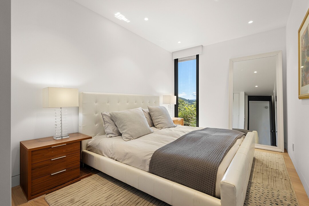 The sumptuous master suite includes a walk-in closet with custom built-in cabinetry and an en-suite bathroom with breathtaking views of the mountains.