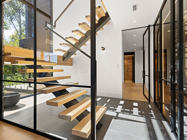 An impressive entrance hall with over 16-foot-high ceilings, oversized windows, and an illuminated staircase with glass railings.
