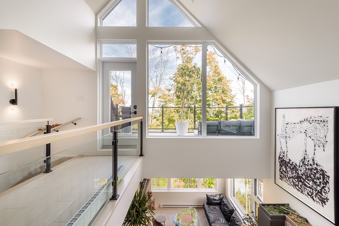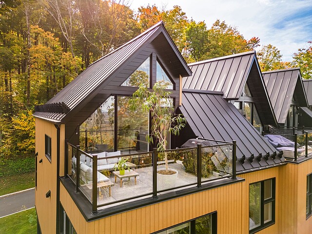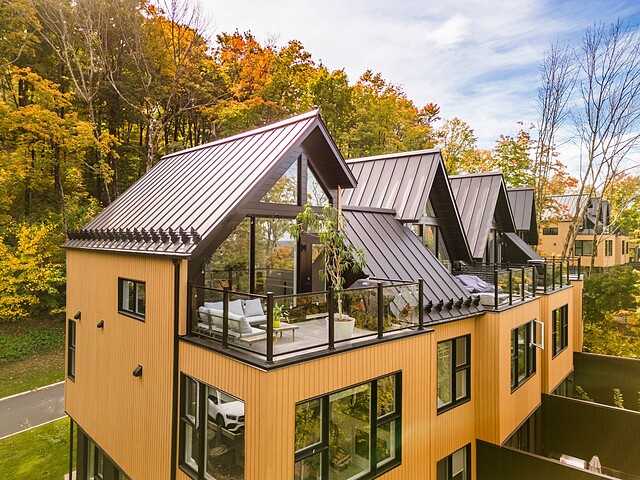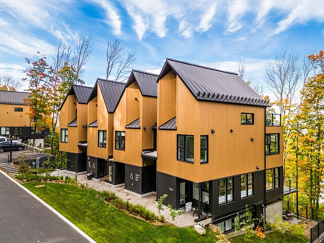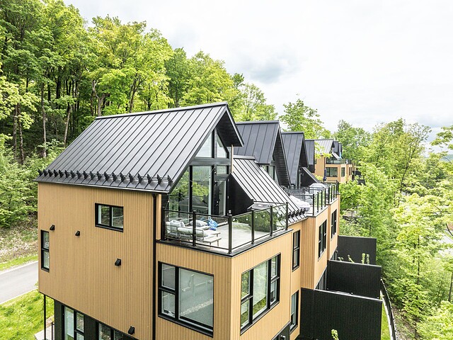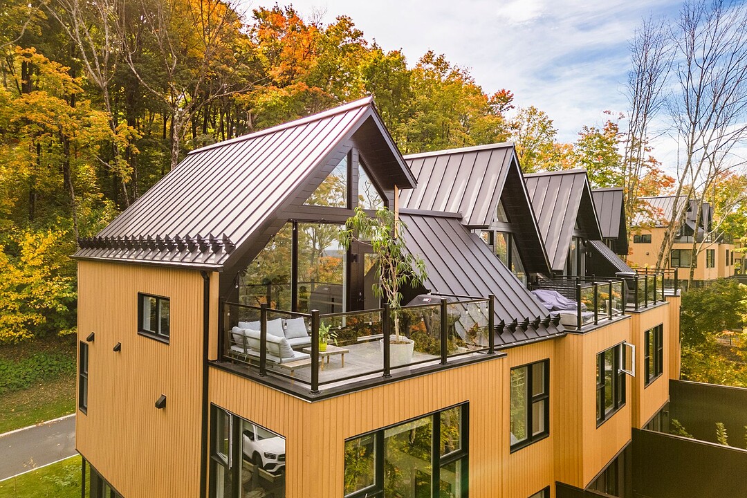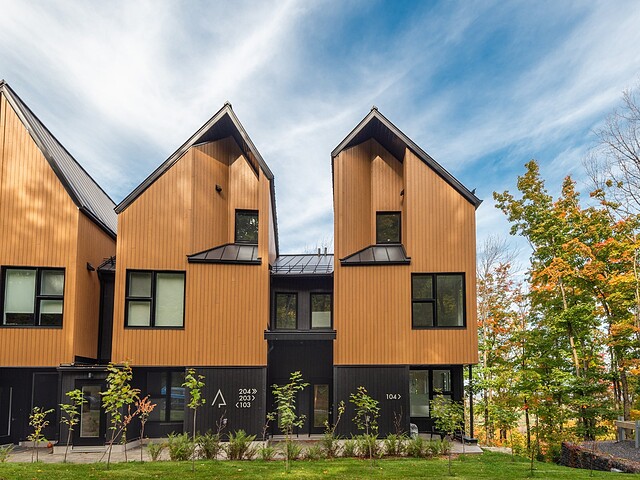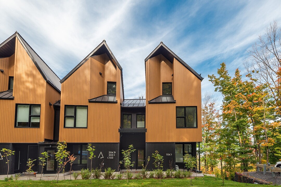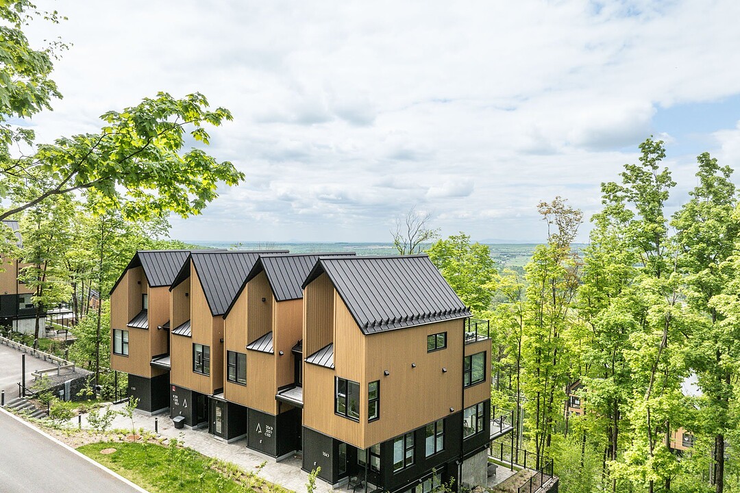 Arborescence condos refuges is an eco-responsible living environment with sleek Scandinavian architecture. Located on the slopes of the Townships, these buildings of just a few units blend perfectly with their surroundings.
