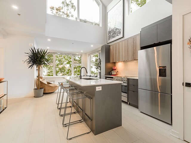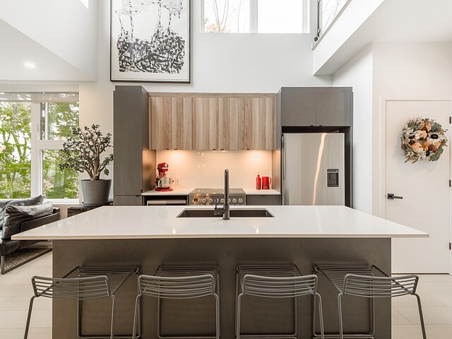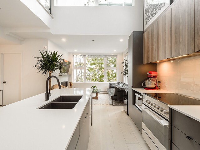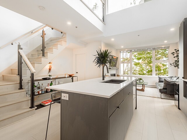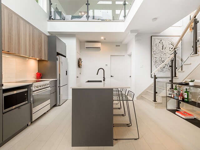 3 large bedrooms, including the master bedroom on the upper floor with breathtaking views. Large open-plan living areas with central island, quartz countertop and lunch counter. Bright dining room and cozy living room with gas fireplace.