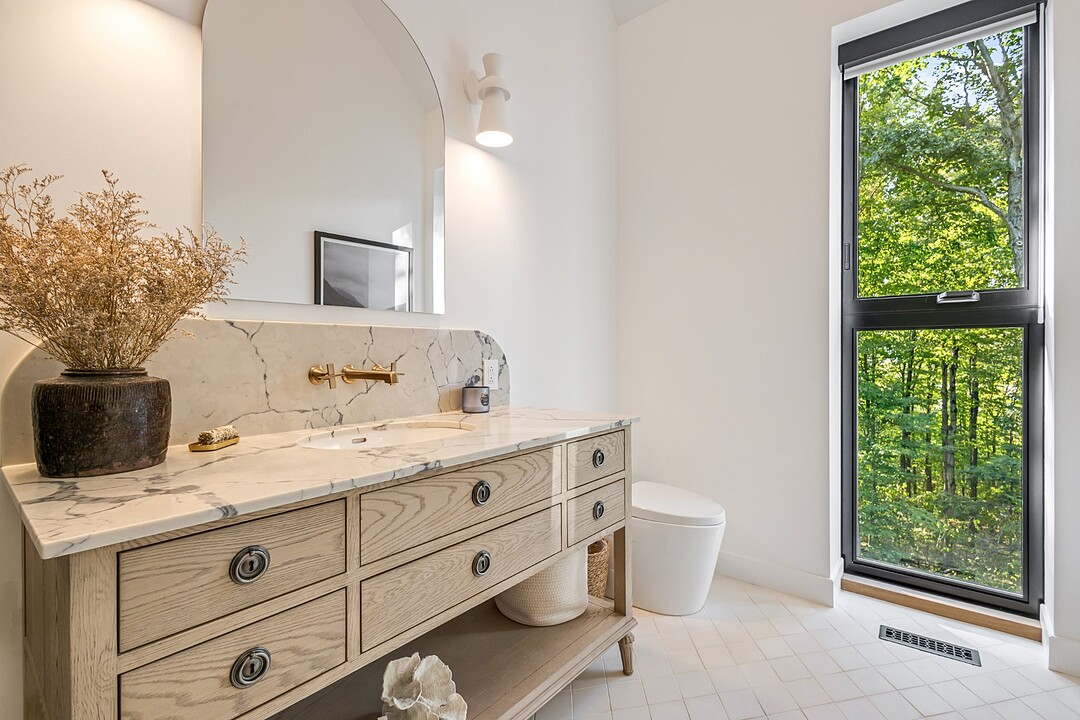 The noble and timeless design by Éric Maillé creates a warm and refined atmosphere. White oak floors -- some in herringbone pattern -- cathedral ceilings, fine porcelains, and custom built-in furnishings give the property its distinctive character.