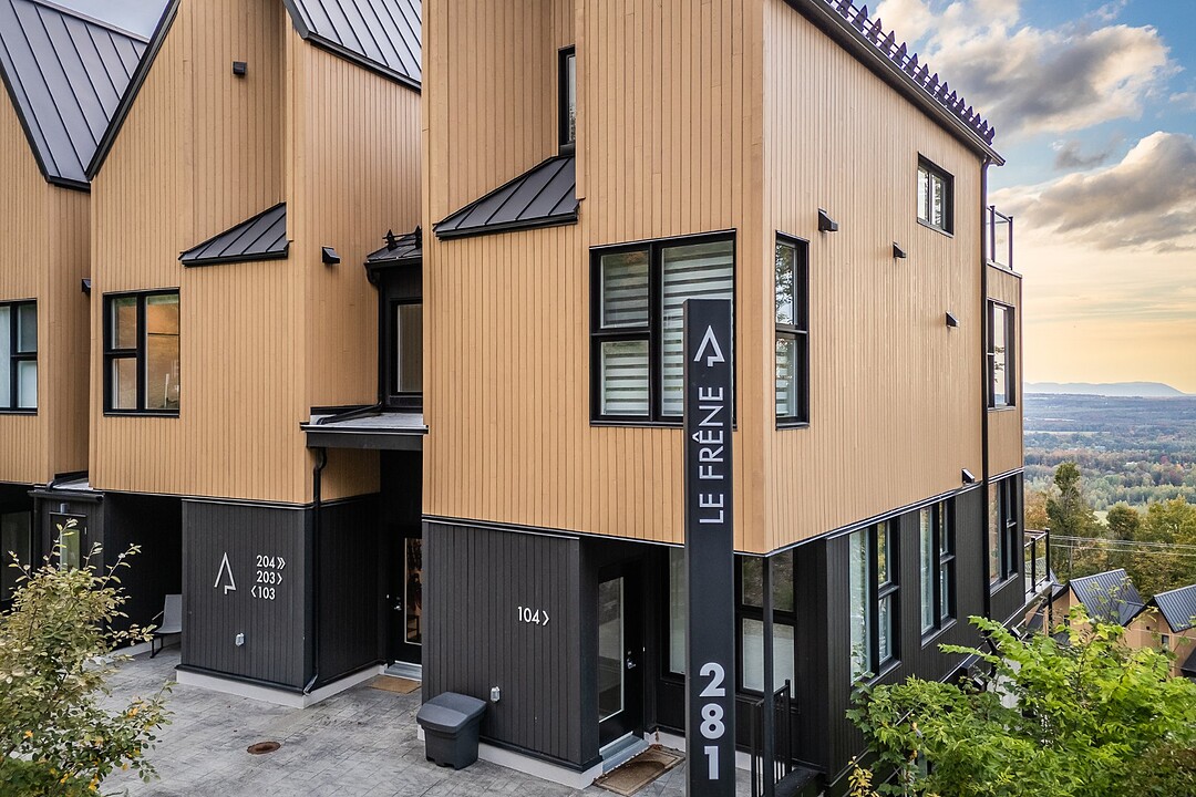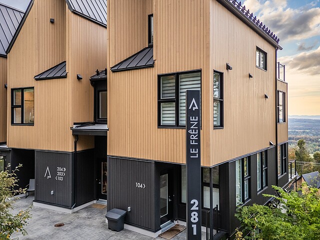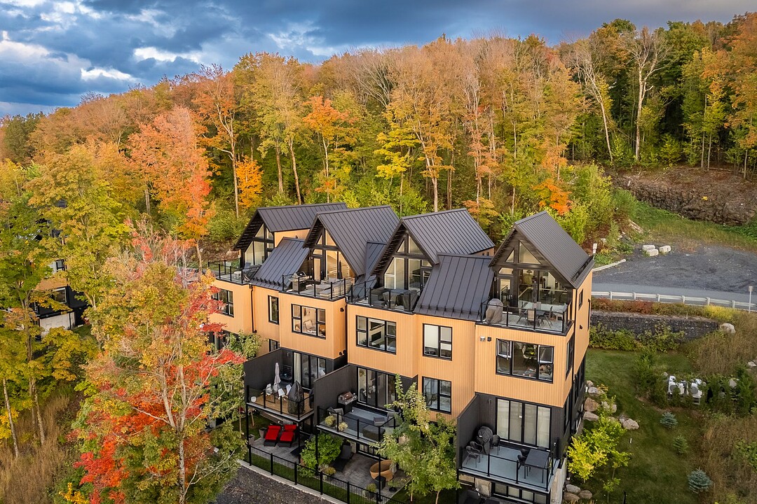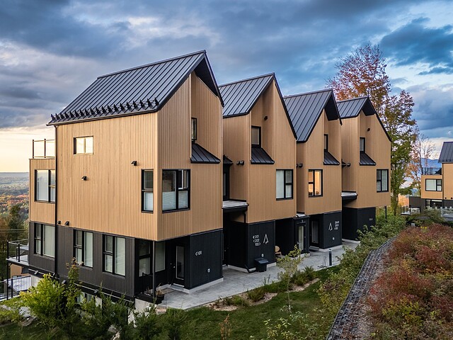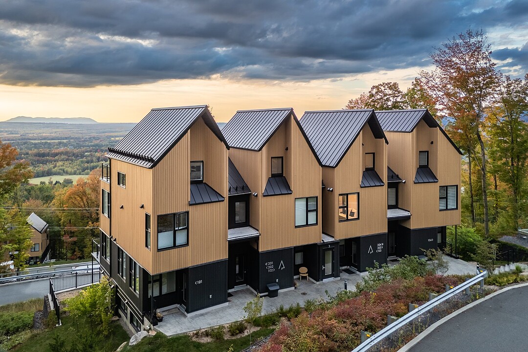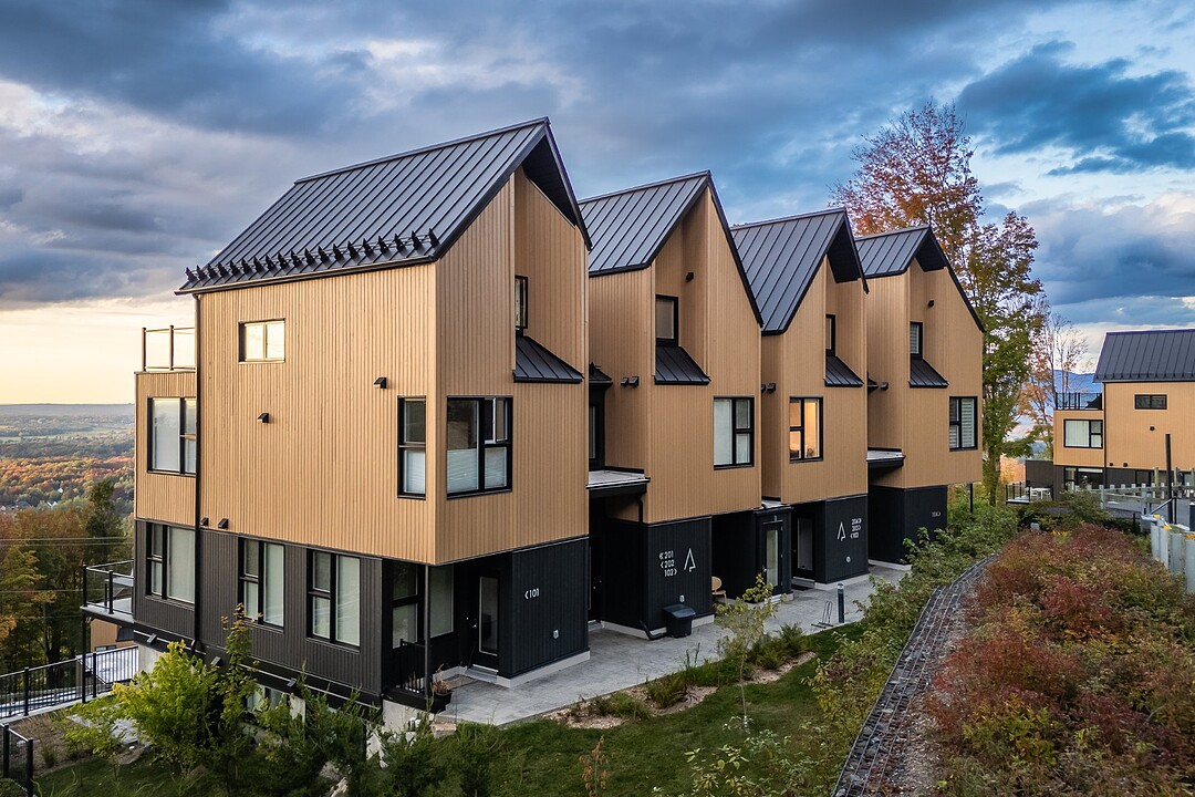 Arborescence Condos Refuges offers an eco-responsible living environment with sleek Scandinavian architecture.