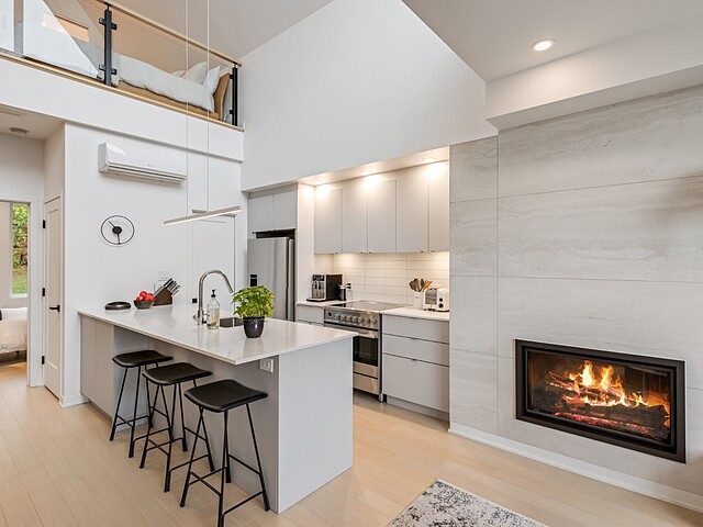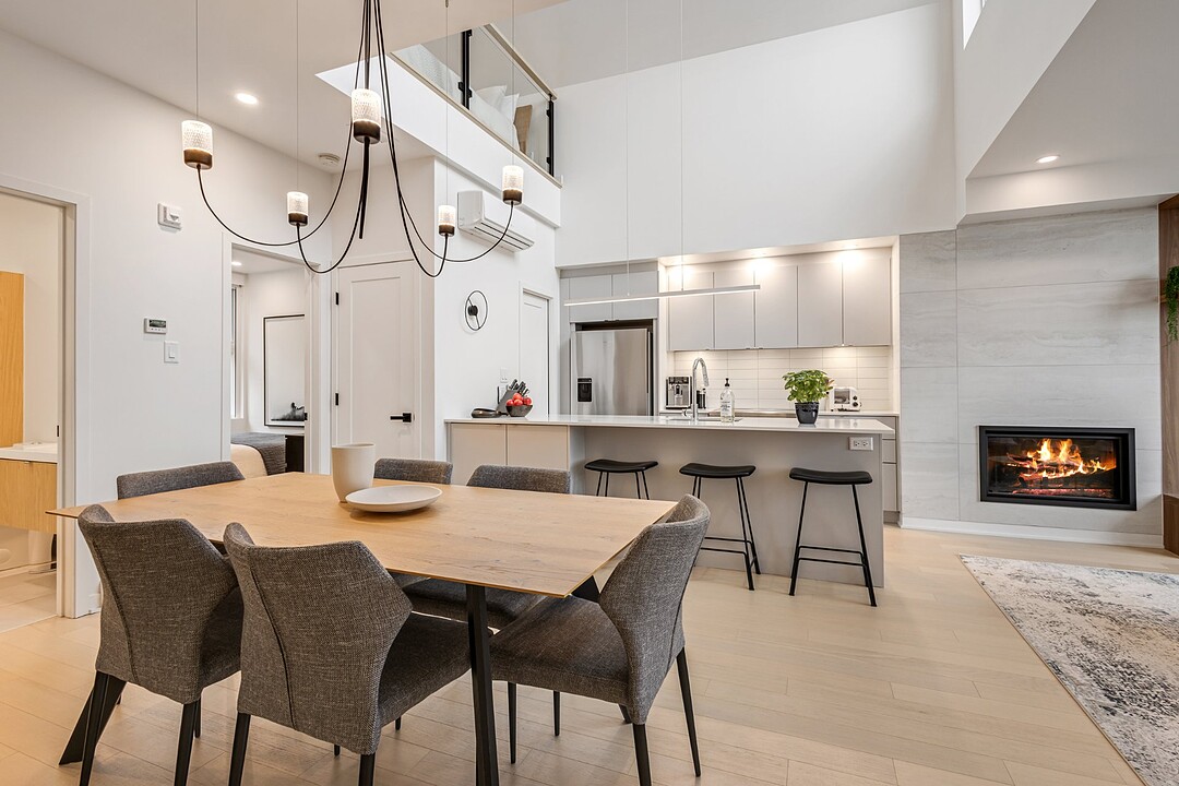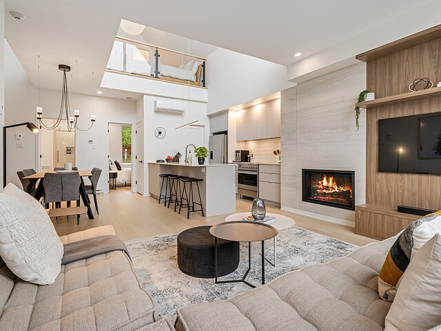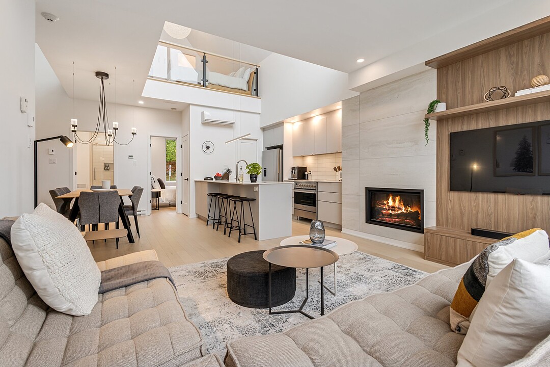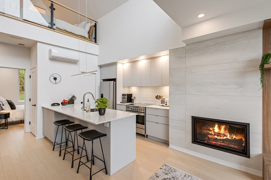 The open-concept living area features a quartz island with breakfast bar, a bright dining area, and a warm living room with gas fireplace. The cathedral ceiling, reaching nearly 25 feet, creates an unparalleled sense of space and grandeur.