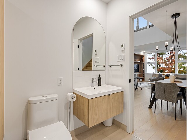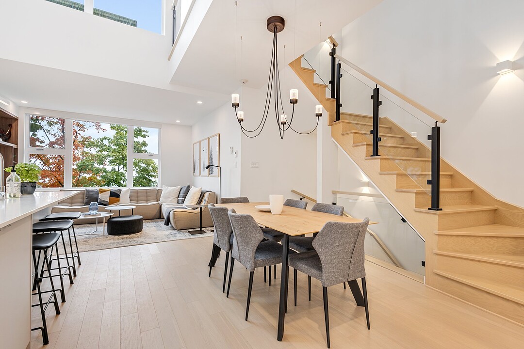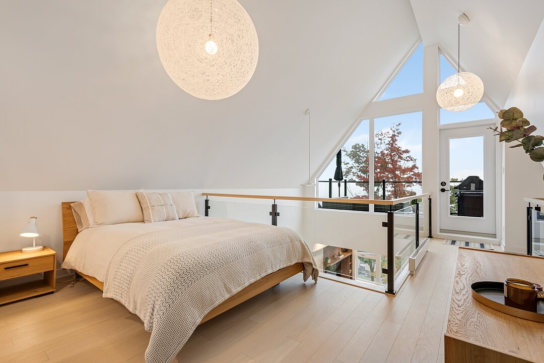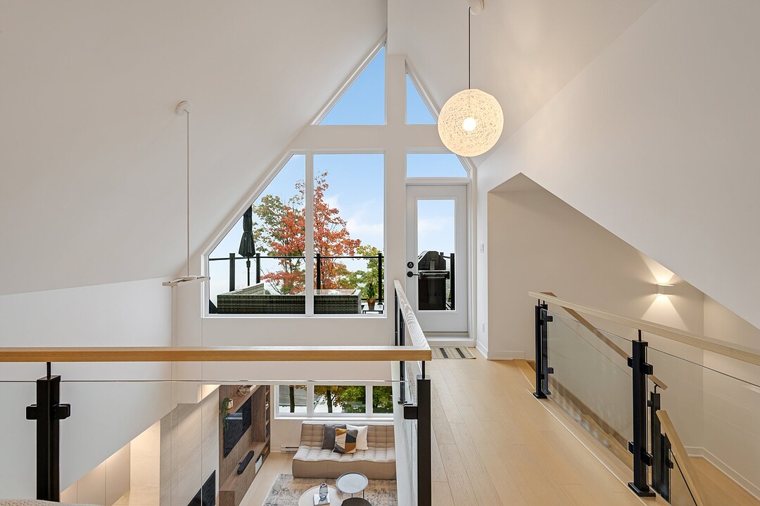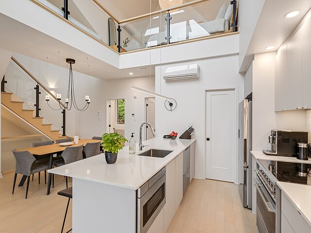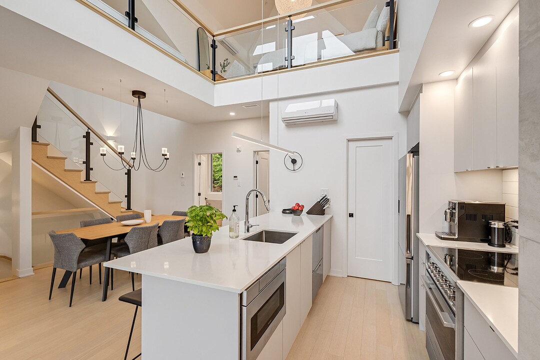 The open-concept living area features a quartz island with breakfast bar, a bright dining area, and a warm living room with gas fireplace. The cathedral ceiling, reaching nearly 25 feet, creates an unparalleled sense of space and grandeur.