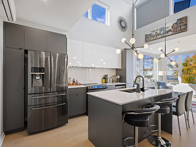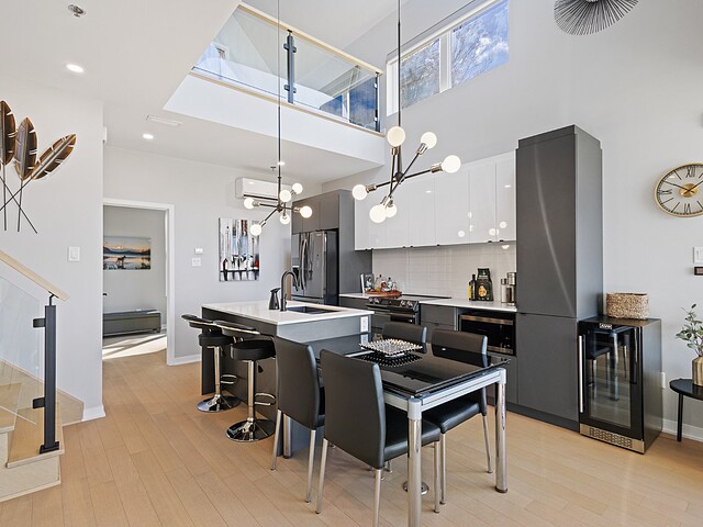 Bright dining room and spacious kitchen with central island, top-of-the-range appliances and plenty of storage space.