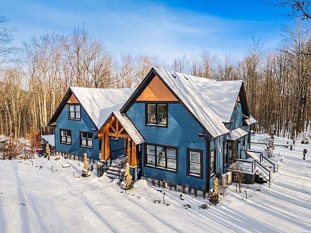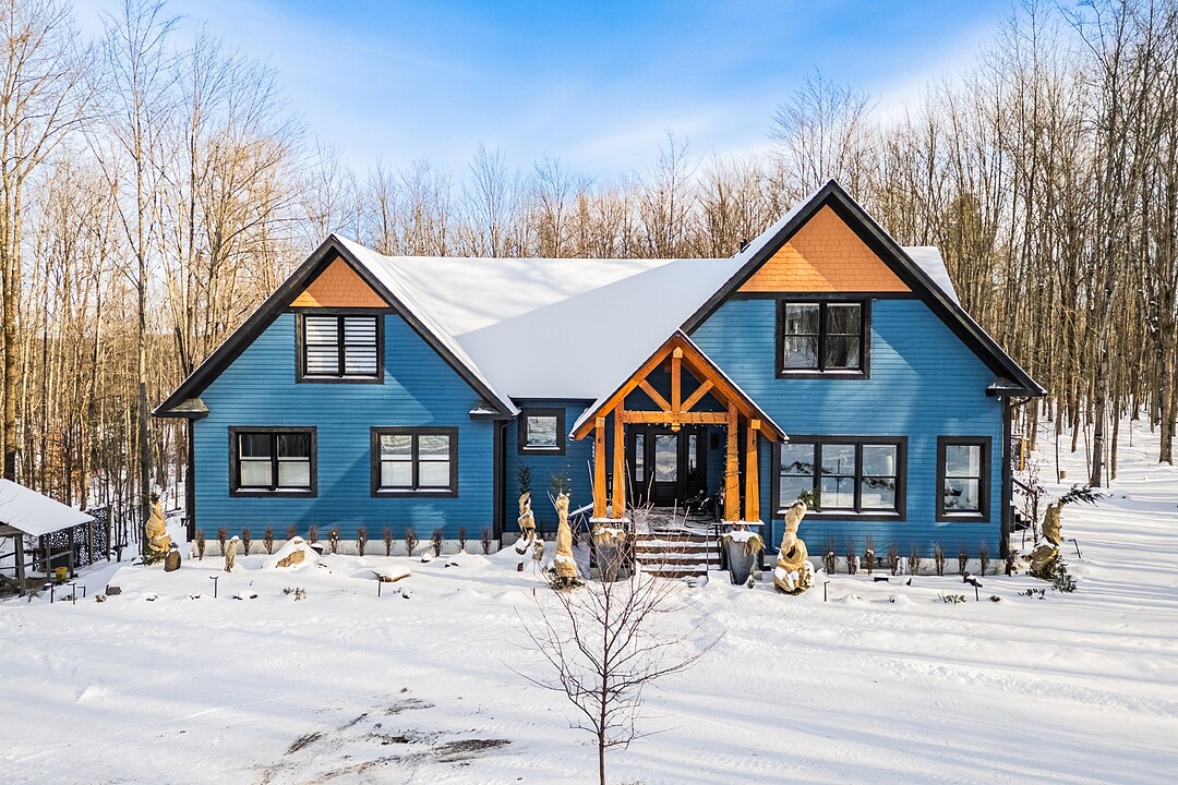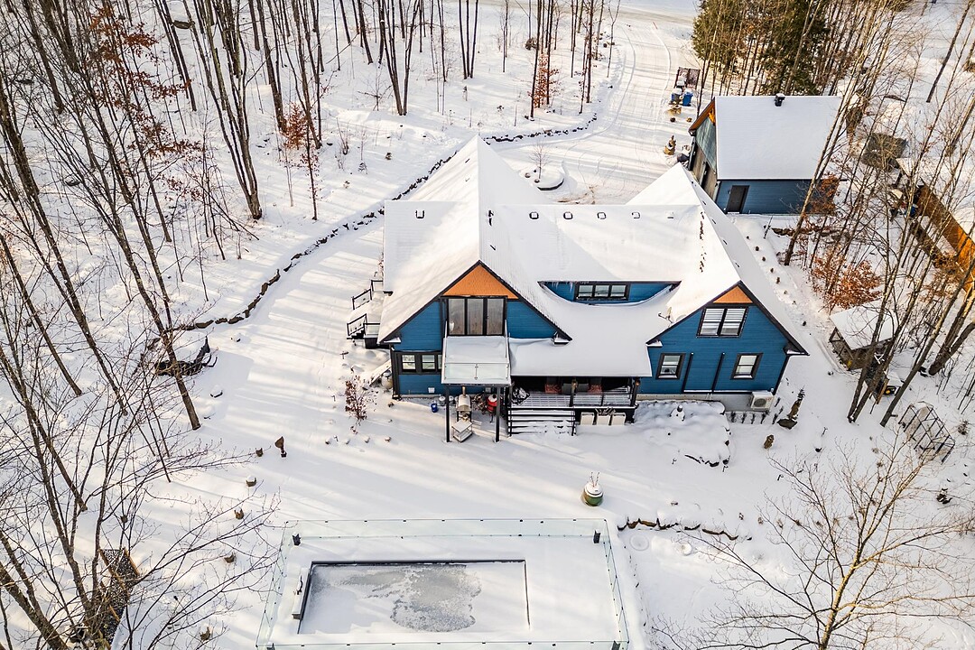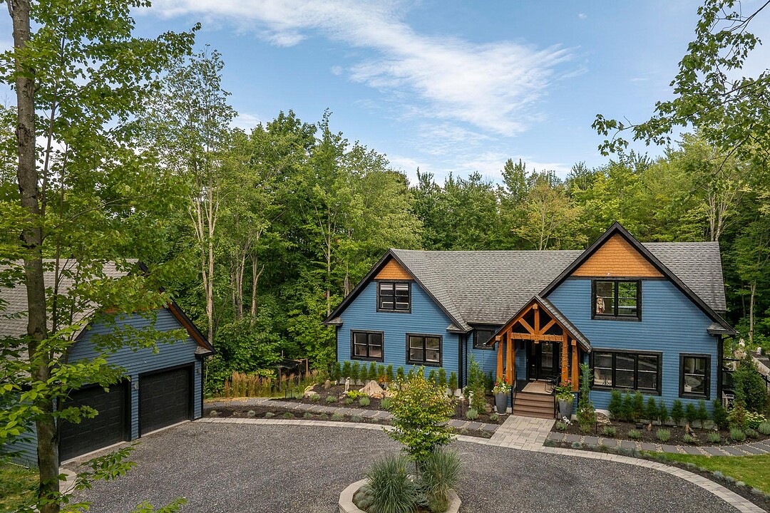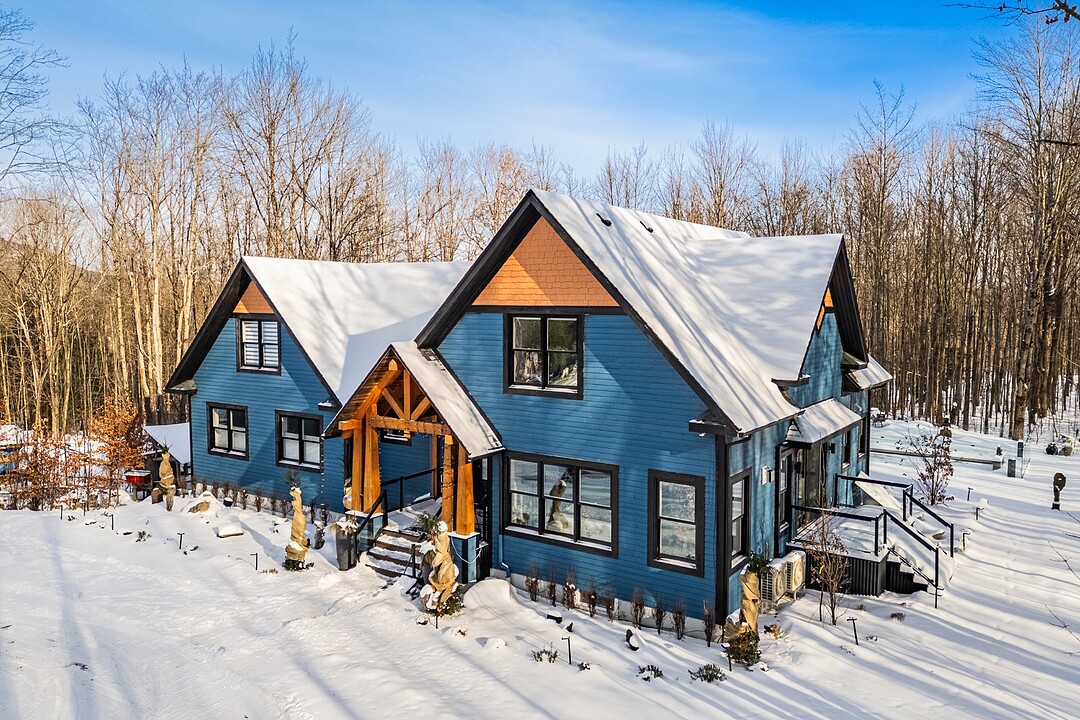 Sumptuous residence just steps away from Bromont's ski mountain! Combining elegance and comfort, this uniquely designed home stands out with its generous volumes and warm atmosphere. Perfectly integrated into its natural surroundings, it offers breathtaking views of nature and unparalleled privacy, all while remaining close to amenities. The outdoor layout, designed for relaxation and entertaining, features a pool, a spa, expansive terraces, a fire pit area, and a double garage. All of this is set on a beautifully wooded lot of over 2 acres, providing a peaceful and exceptional living environment. A must-see!