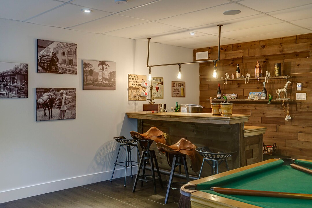 The fully finished basement offers a large family room with a bar area, a gym, an additional bedroom, a laundry room, and a powder room.