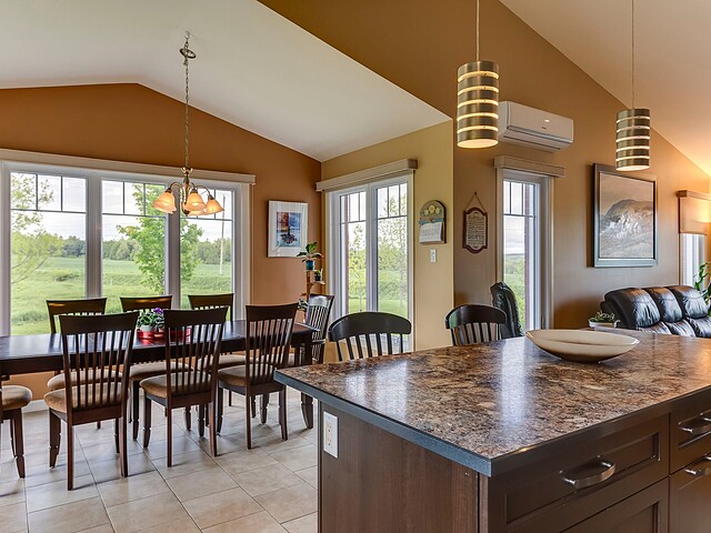 You'll be charmed by its radiant heated floors, cathedral ceiling, and breathtaking views of the surrounding nature. The home offers a warm and inviting atmosphere.