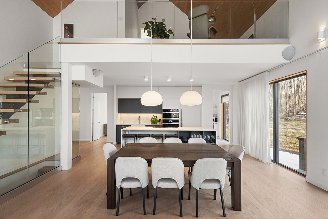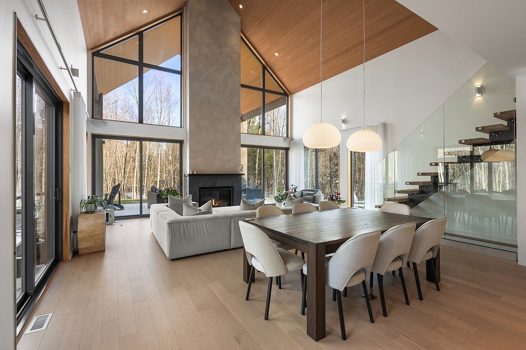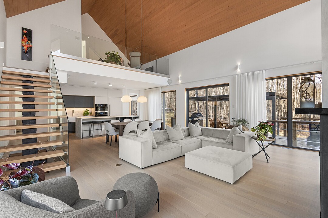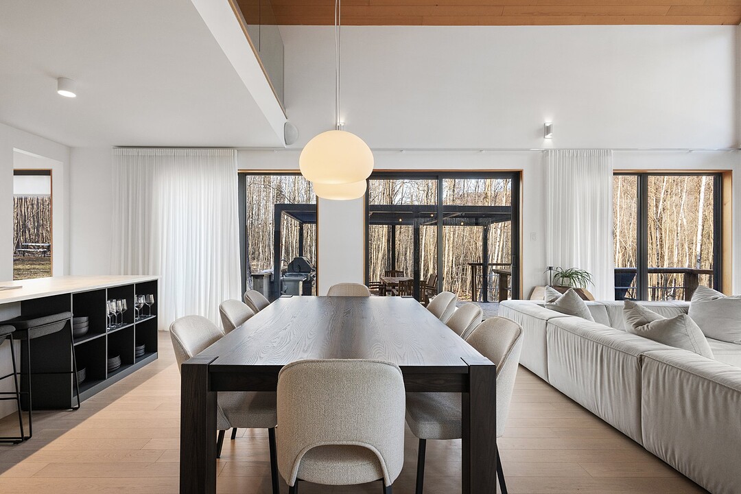 The main living area, both minimalist and warm, offers an open-concept layout bathed in natural light.