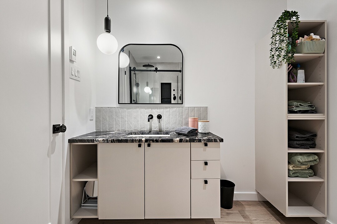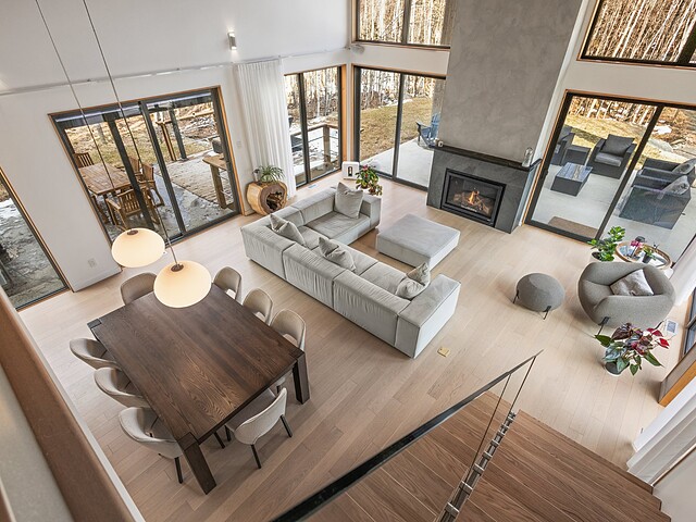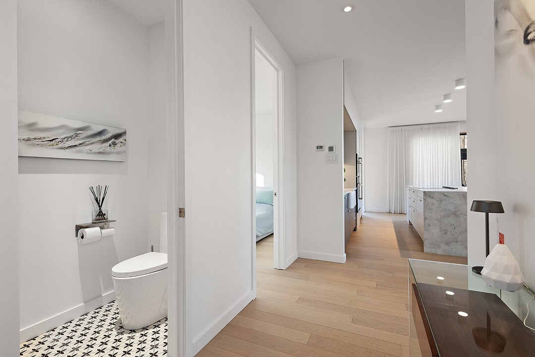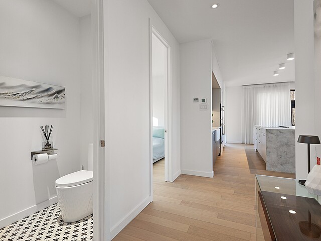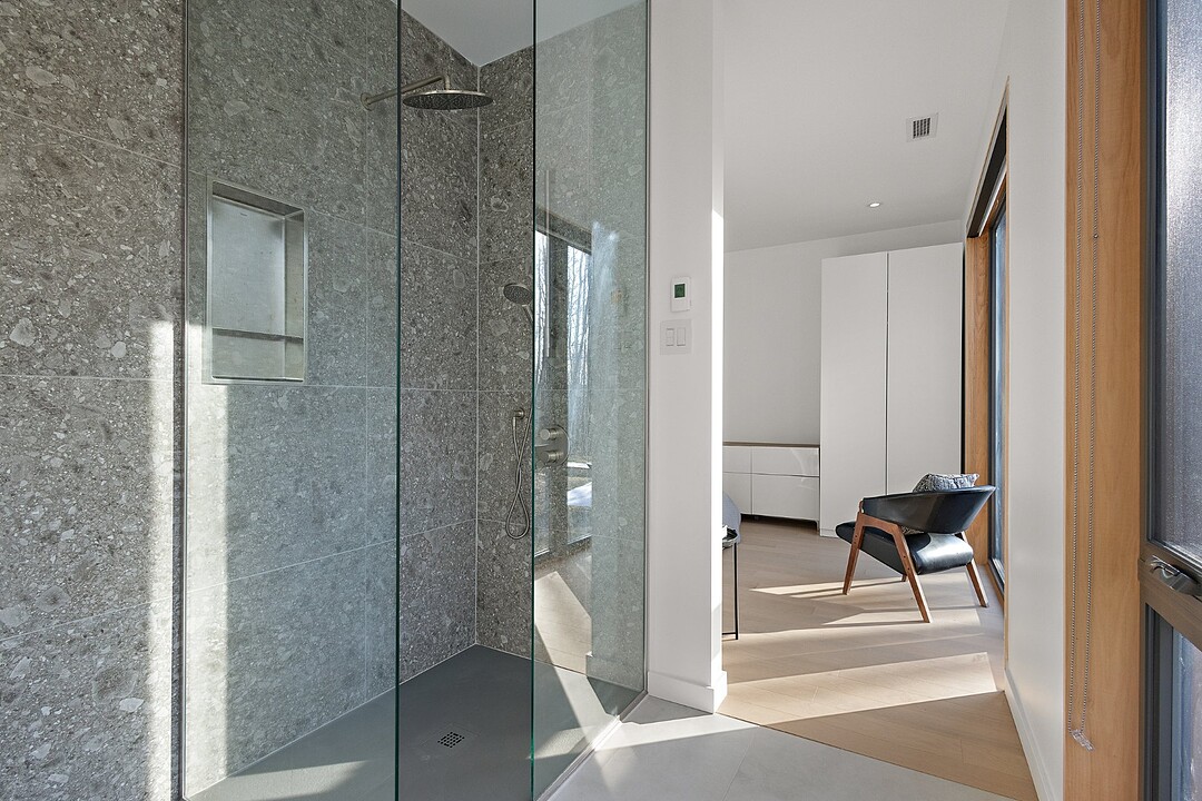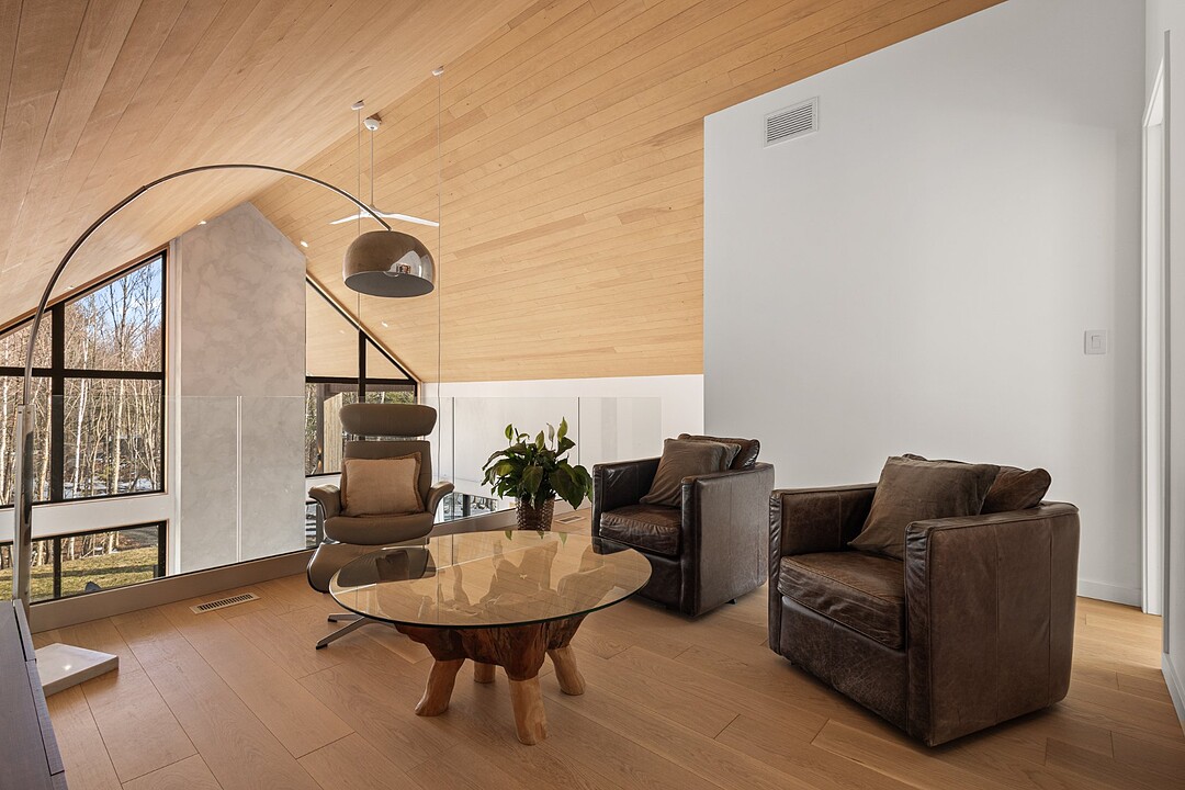 The main living area, both minimalist and warm, offers an open-concept layout bathed in natural light.