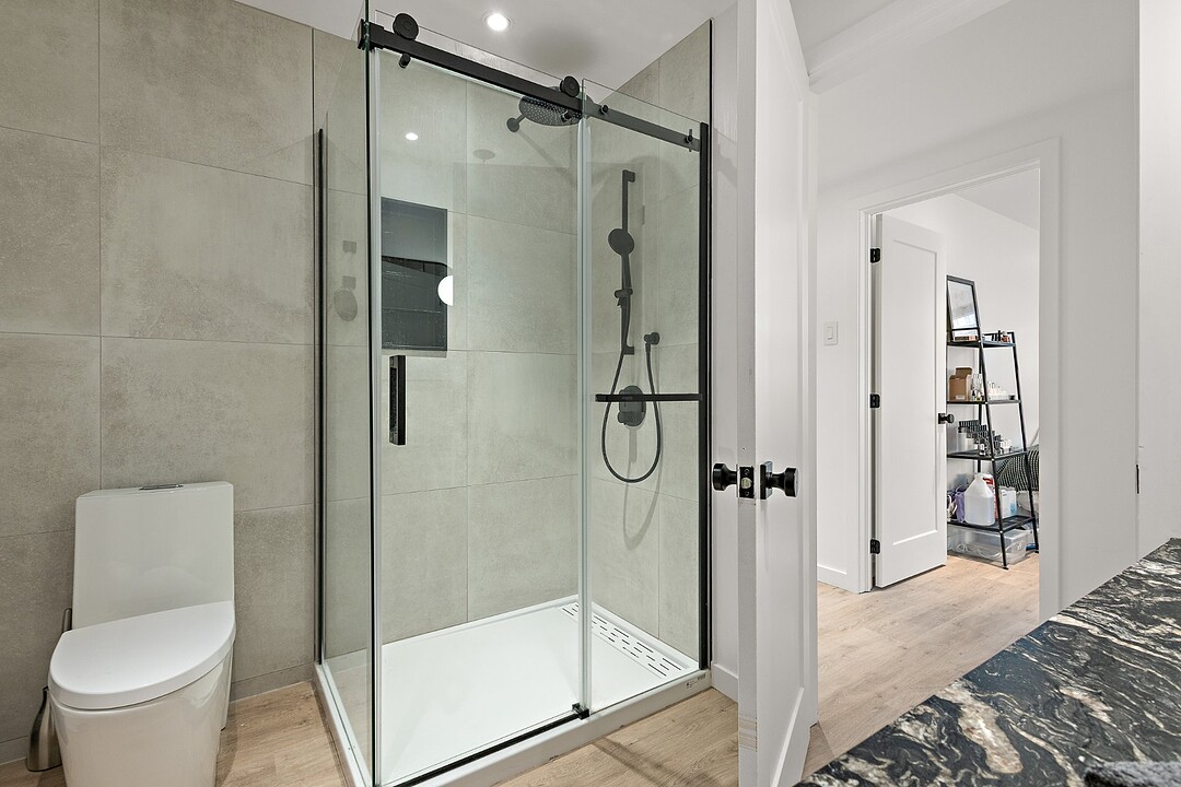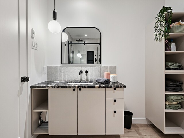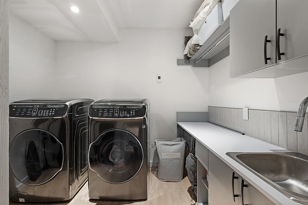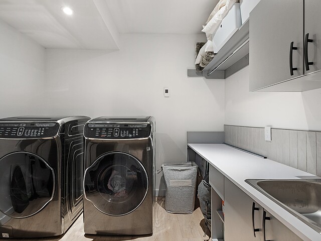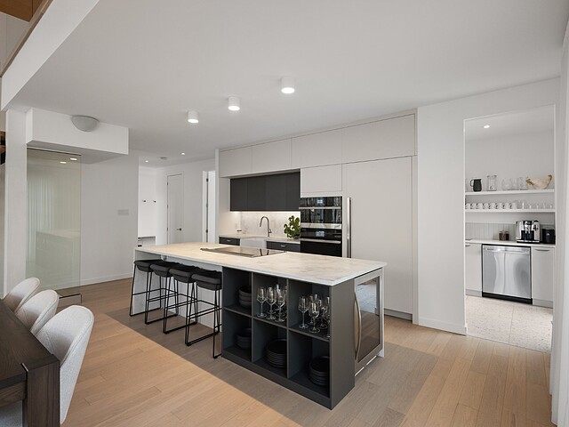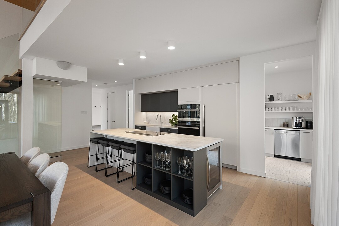 The kitchen stands out with its stunning quartz island (grade 7), custom cabinetry, high-end appliances, and a thoughtfully designed spacious pantry.