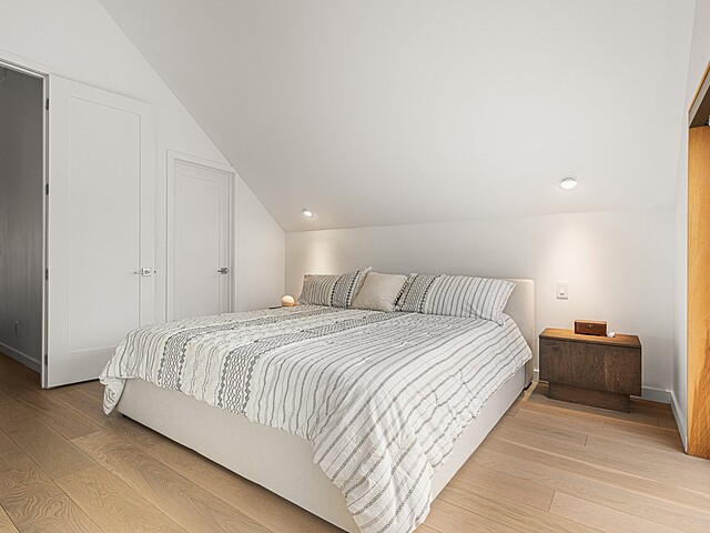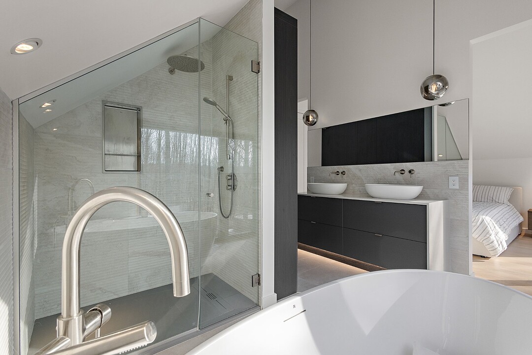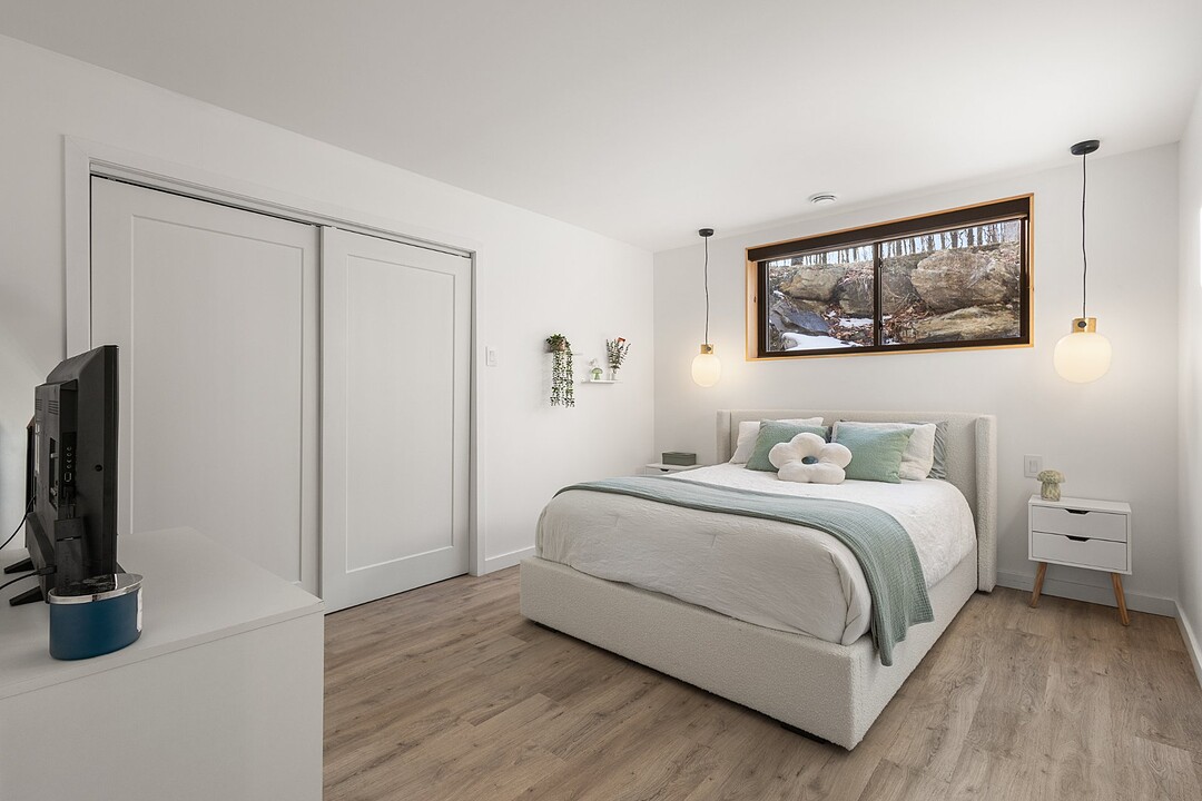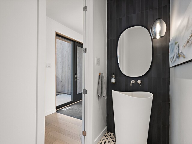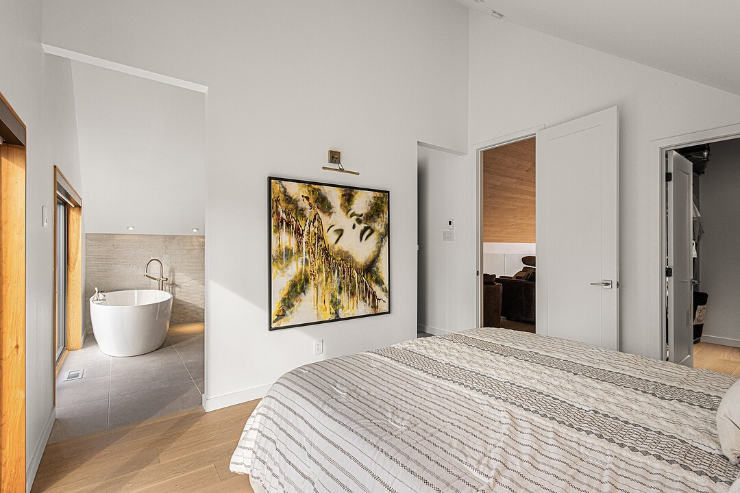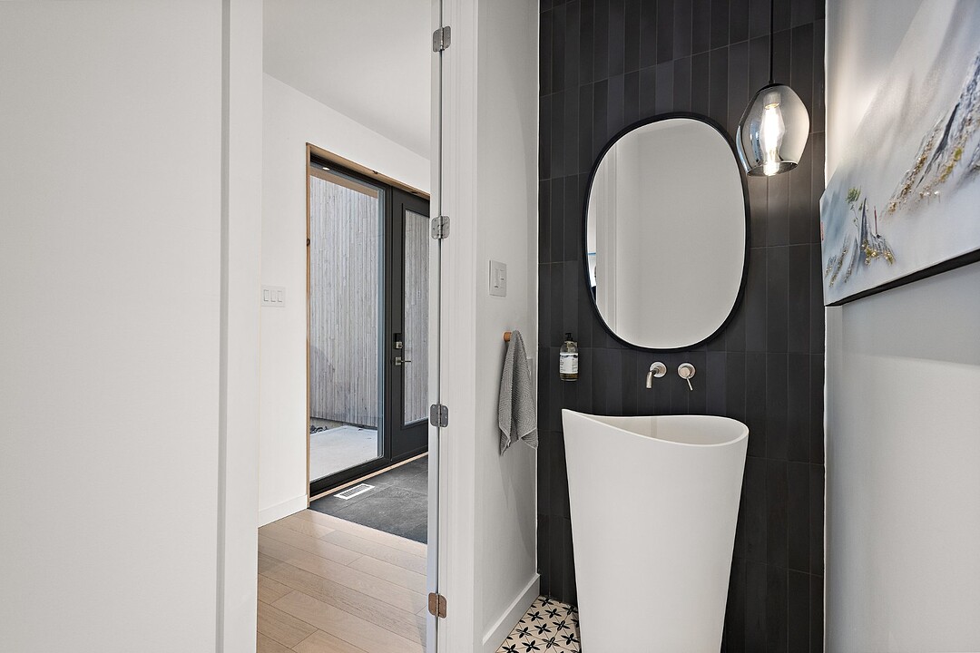 Also on the main floor: a bedroom with an en-suite bathroom and a convenient powder room for guests.