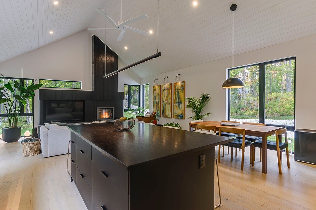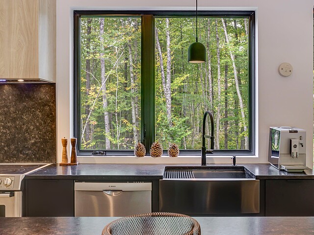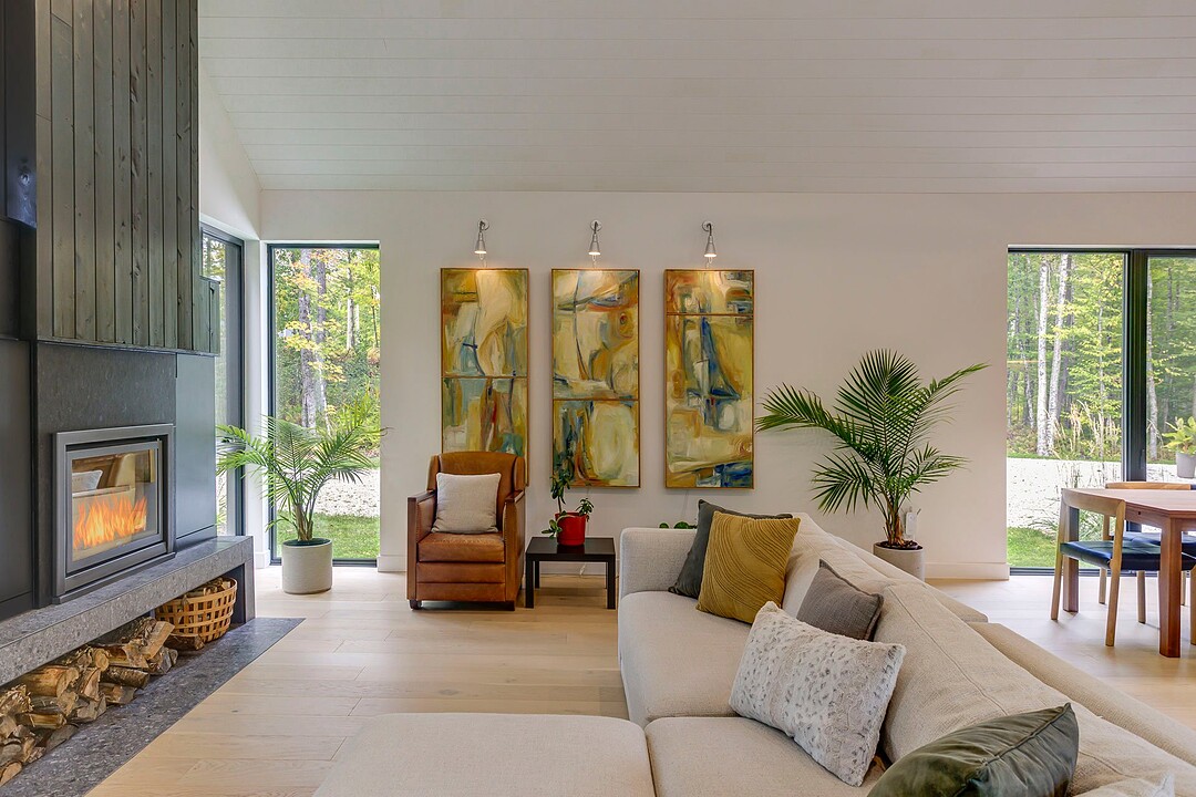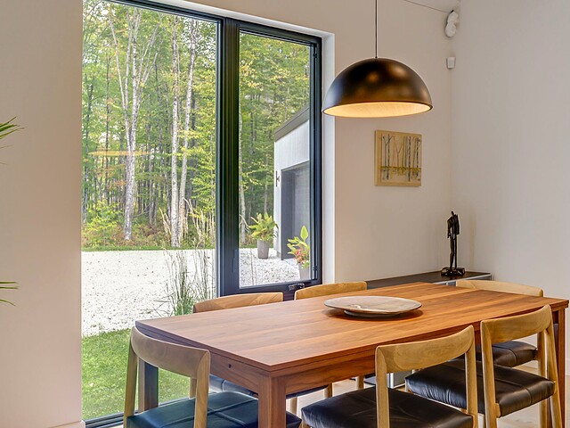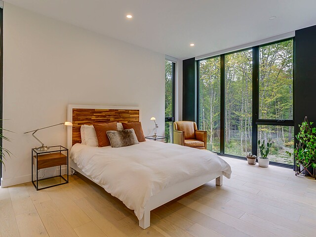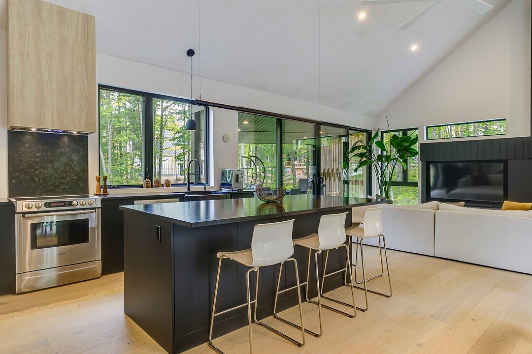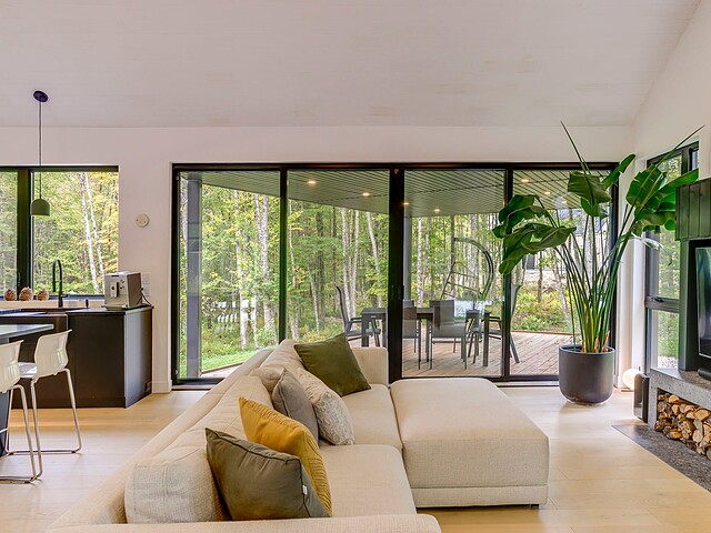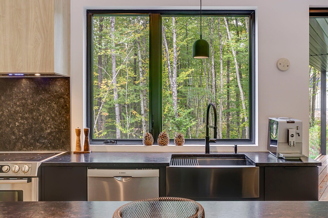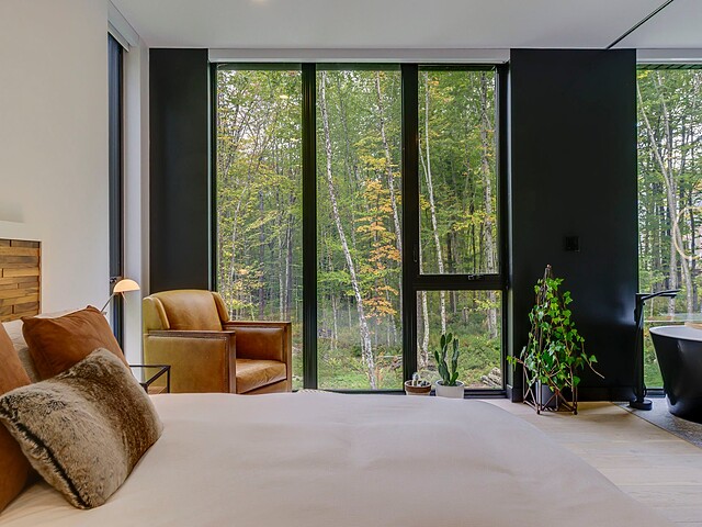 Oversized floor-to-ceiling windows flood the interior with natural light while highlighting the beauty of the surrounding forest.
