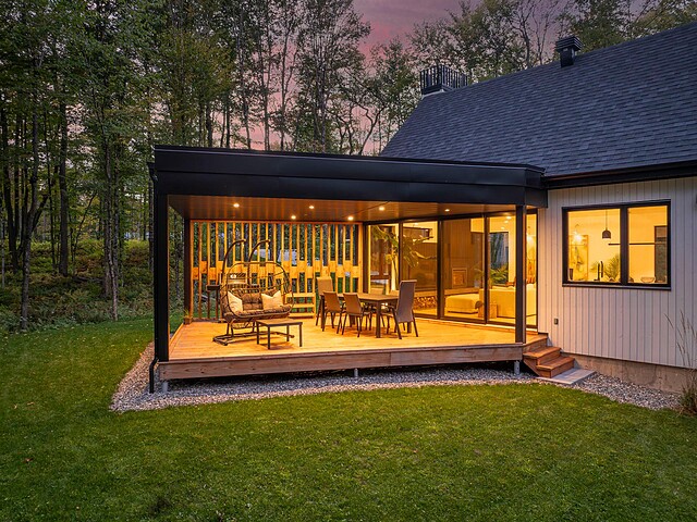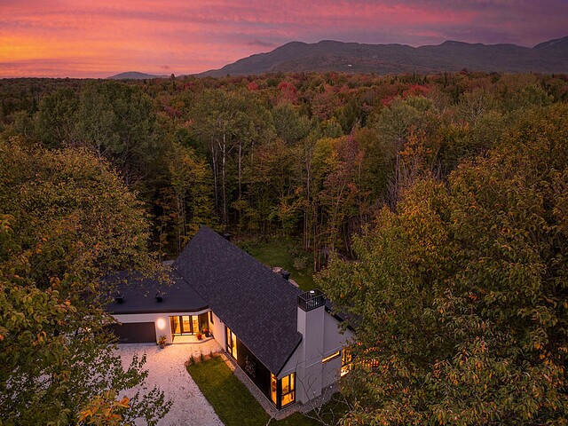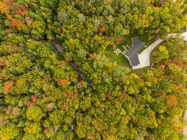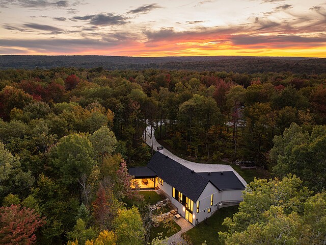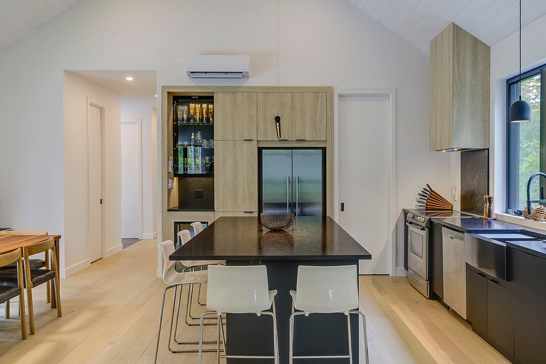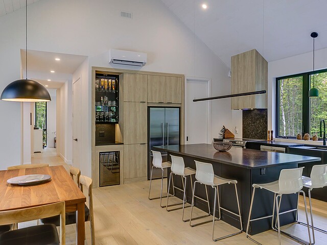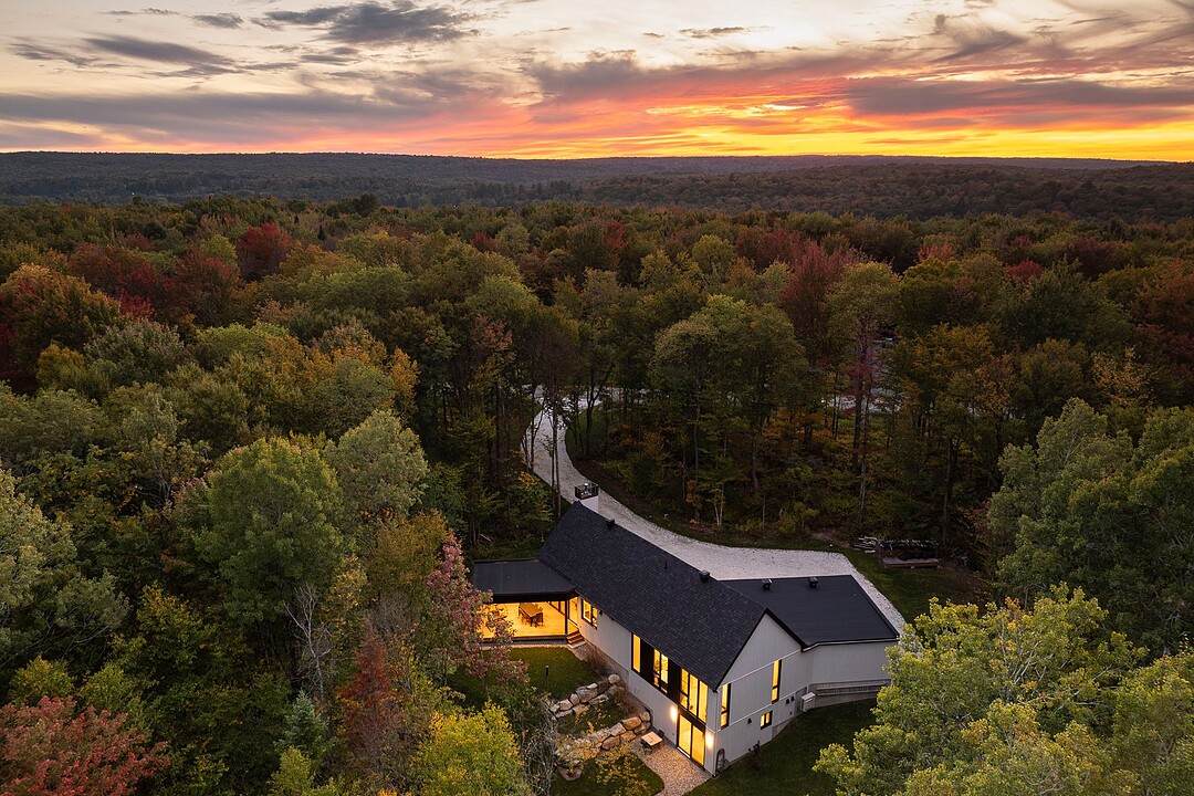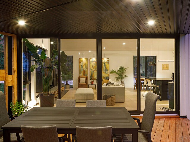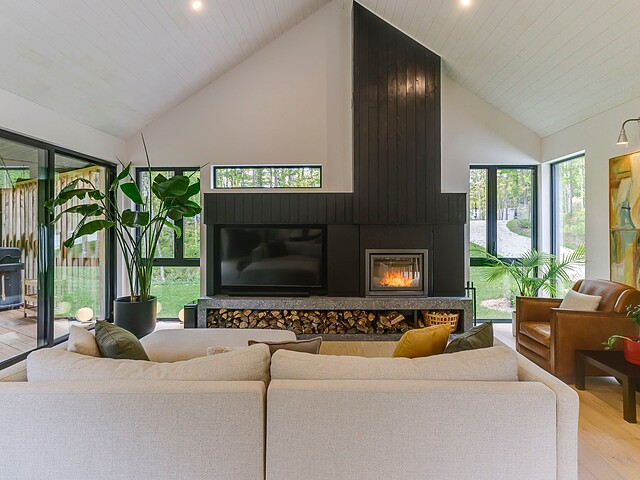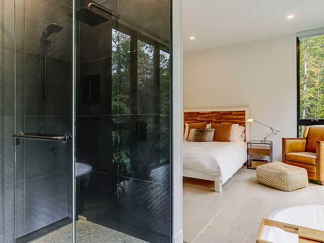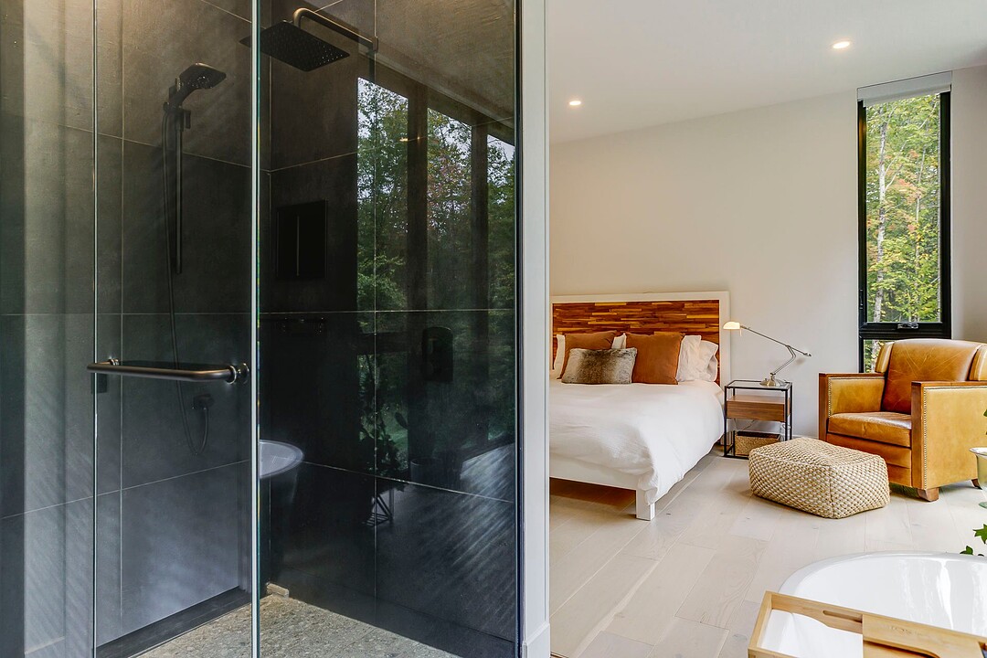 Oversized floor-to-ceiling windows flood the interior with natural light while highlighting the beauty of the surrounding forest.