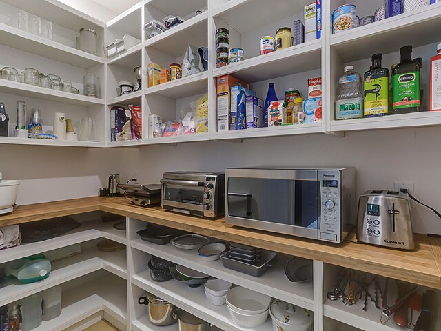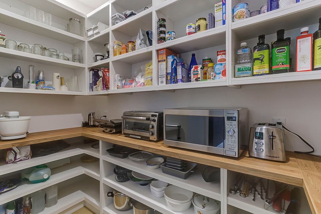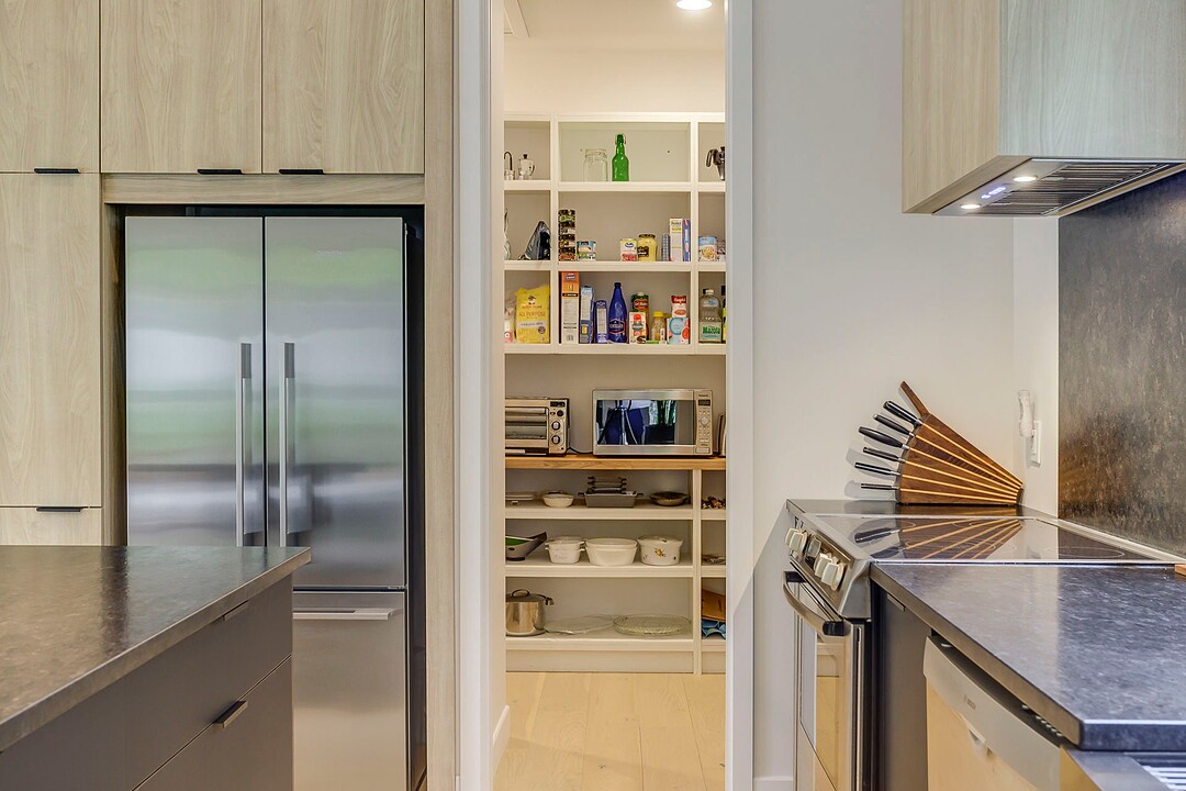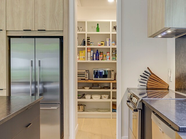 The kitchen, both functional and elegant, is equipped with a spacious pantry offering maximum storage.