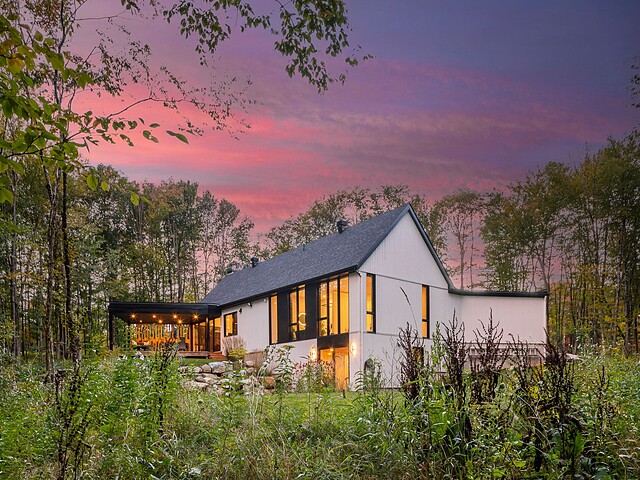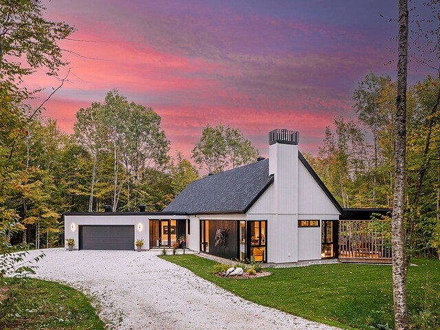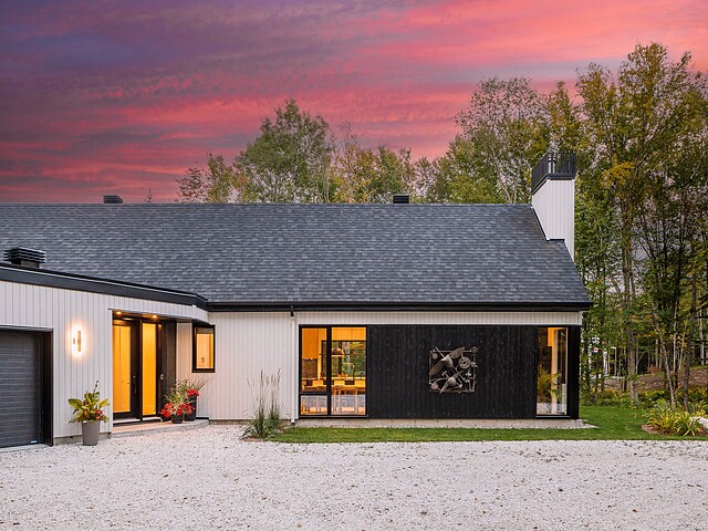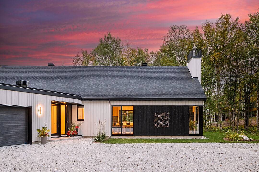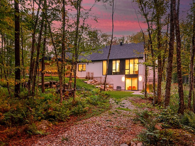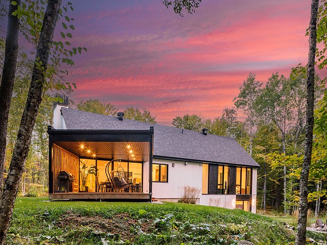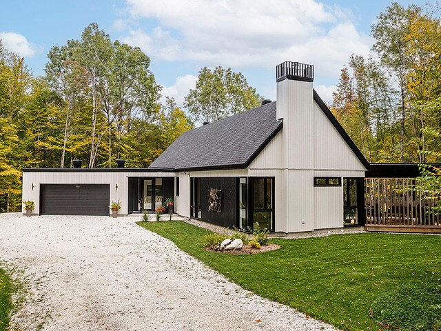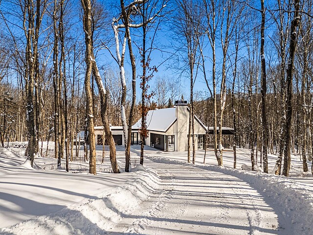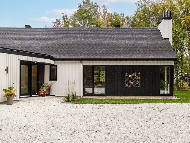 Exceptional bungalow nestled on a private 2.5-acre lot! Bordered by a beautiful river and landscaped trails, this true nature retreat offers unmatched tranquility. Its thoughtful design includes a private master wing, an open living area with cathedral ceilings and expansive windows, as well as a functional garden level. The clean lines and high-end materials create an atmosphere that is both warm and refined. Located in Le Boisé du Lac Parker, you will enjoy complete privacy while remaining close to amenities and outdoor activities!