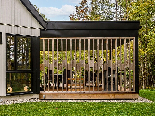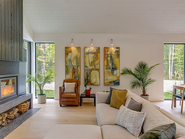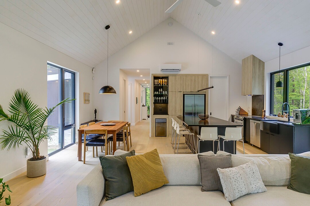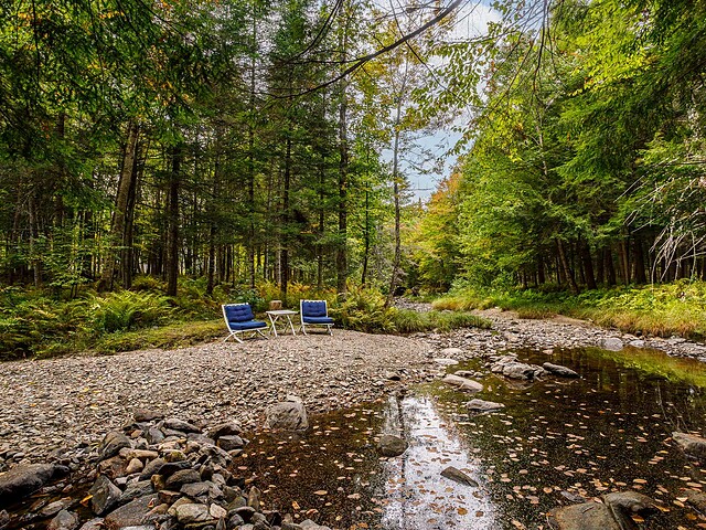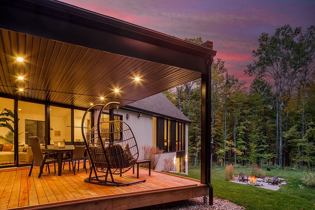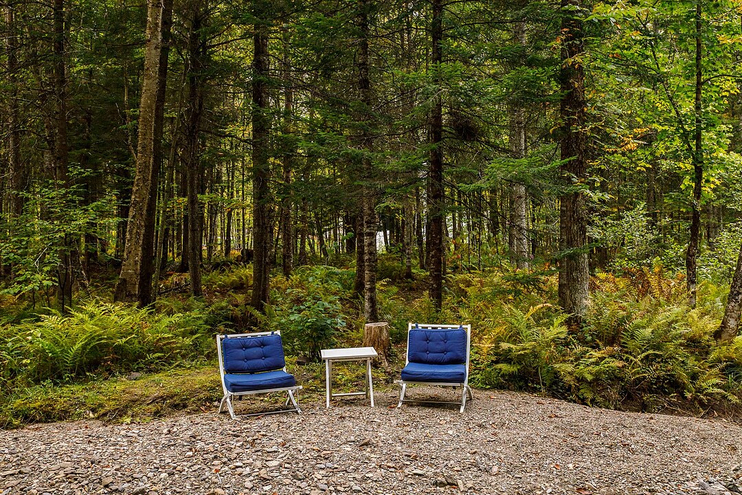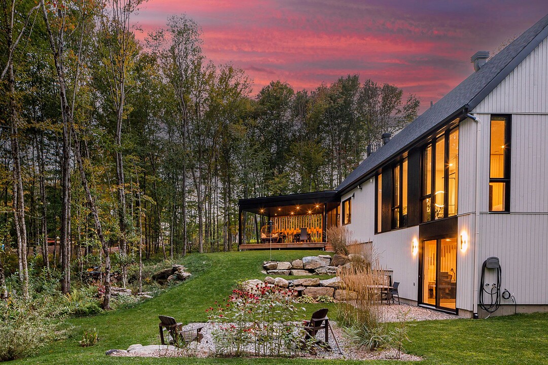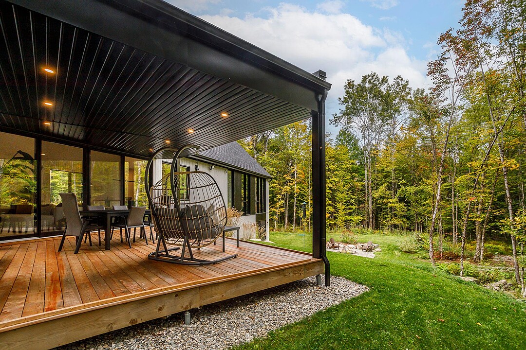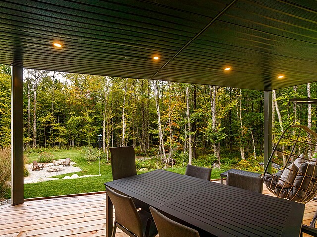 Outside, the landscaping is simply remarkable: an intimate terrace, fire pit area, walking trails, and direct access to the river. A peaceful environment, enhanced by the gentle sound of flowing water and the presence of mature trees.