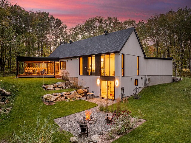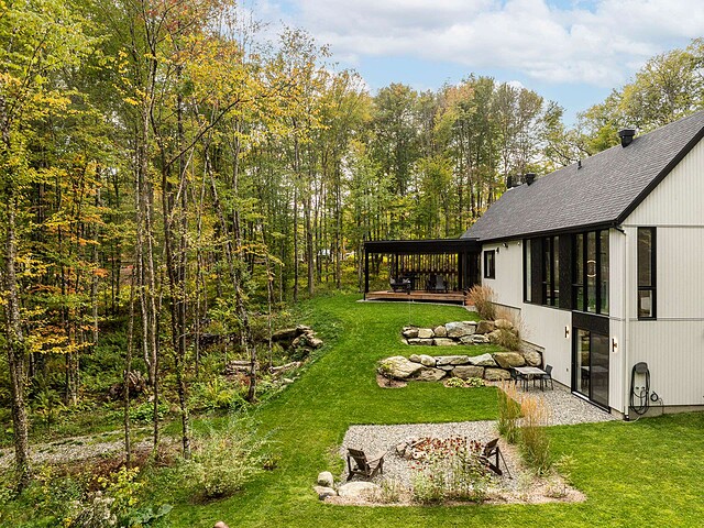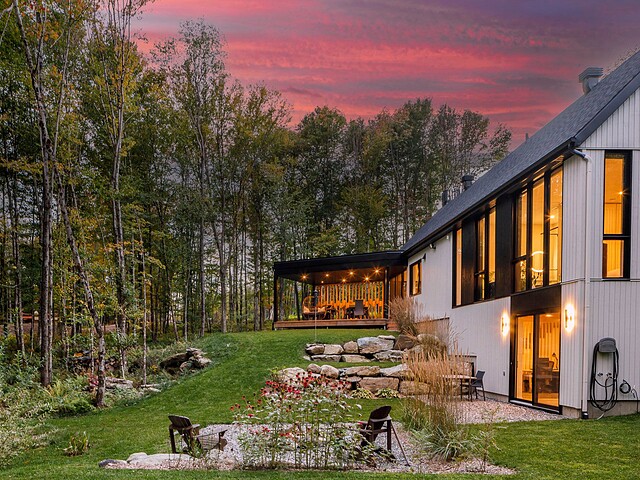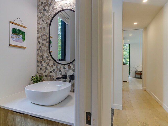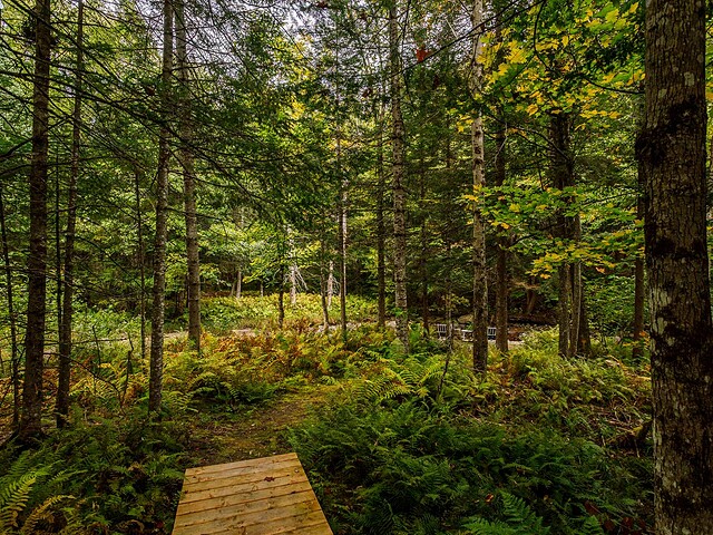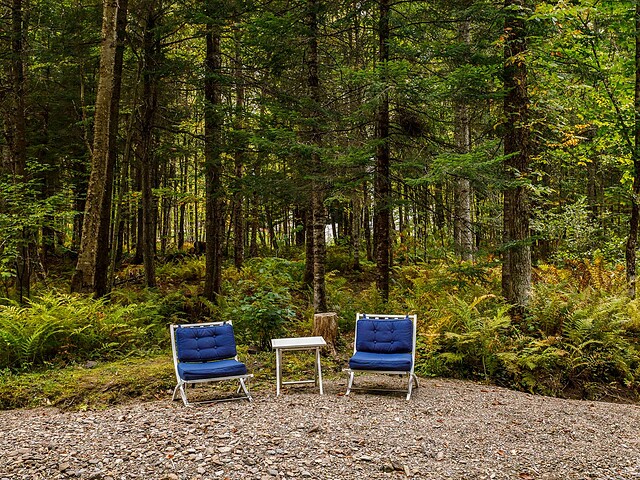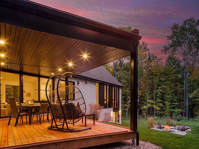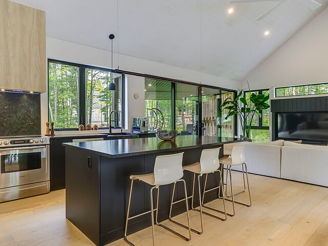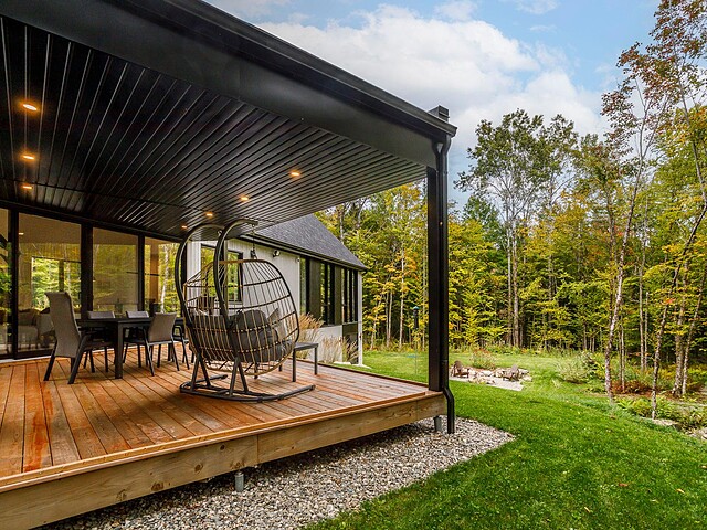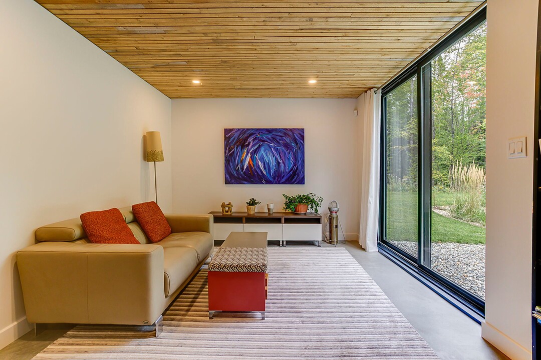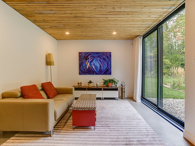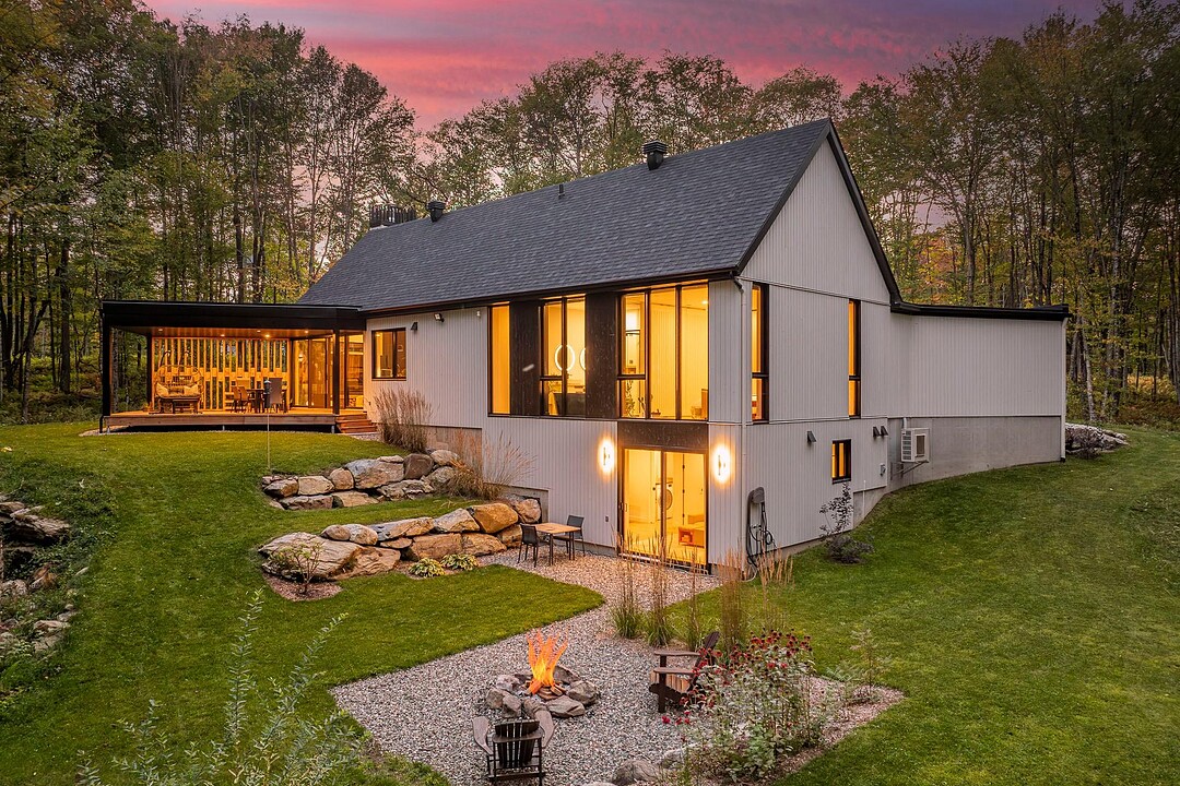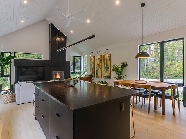 Outside, the landscaping is simply remarkable: an intimate terrace, fire pit area, walking trails, and direct access to the river. A peaceful environment, enhanced by the gentle sound of flowing water and the presence of mature trees.