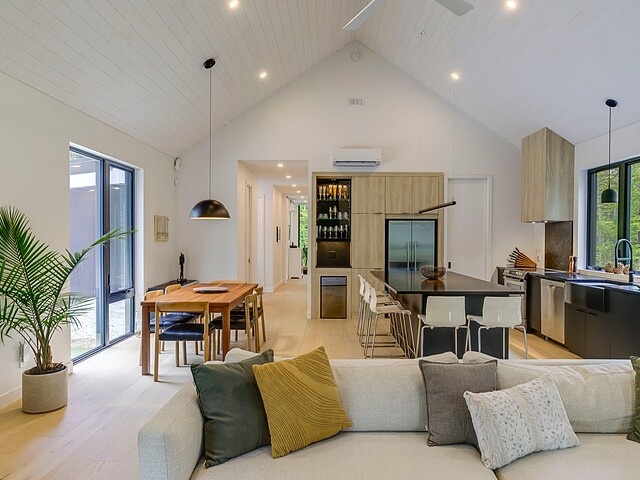 The main living area charms with its warm and inviting atmosphere, featuring a wood-burning fireplace and cathedral ceilings soaring over 15 feet high.