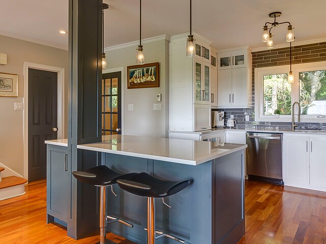 The fully renovated kitchen features a large, inviting island and stunning quartz countertops.