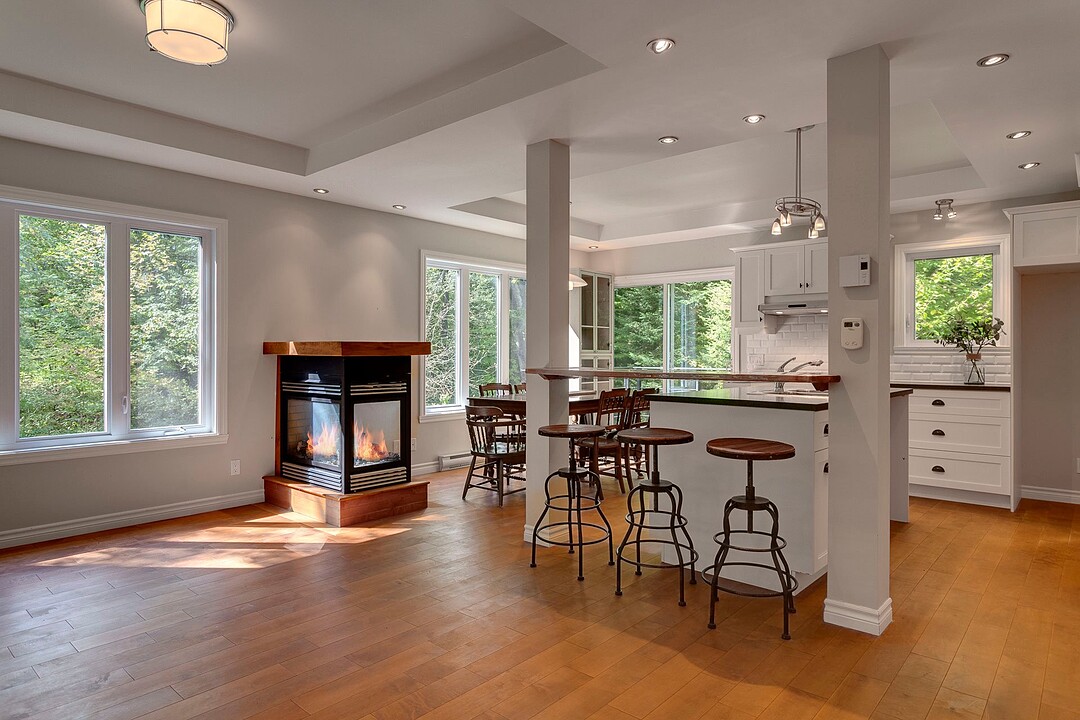 Warm and family-friendly, it offers an open-concept main living area enhanced by a triple-sided fireplace, beautiful hardwood floors, and abundant natural light.