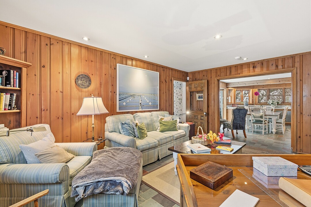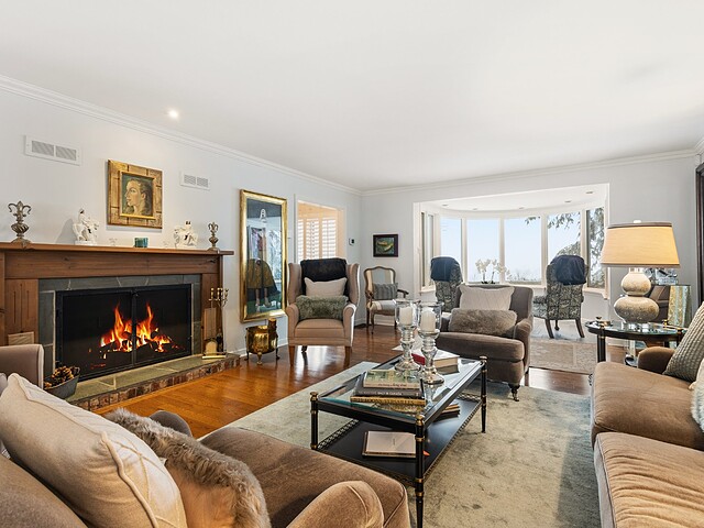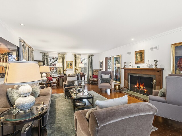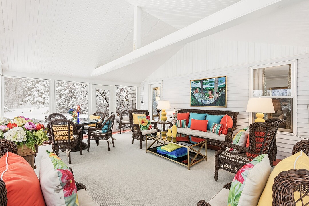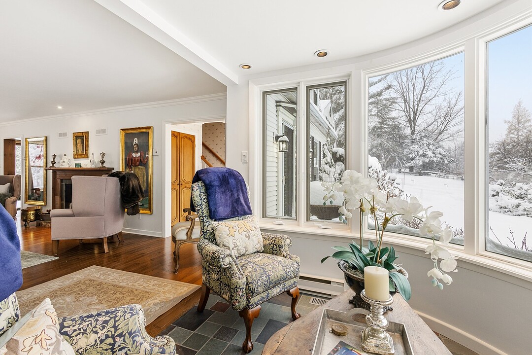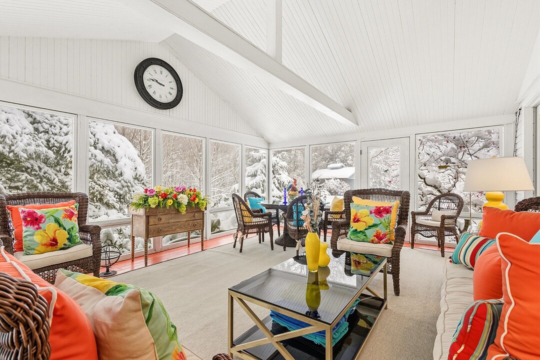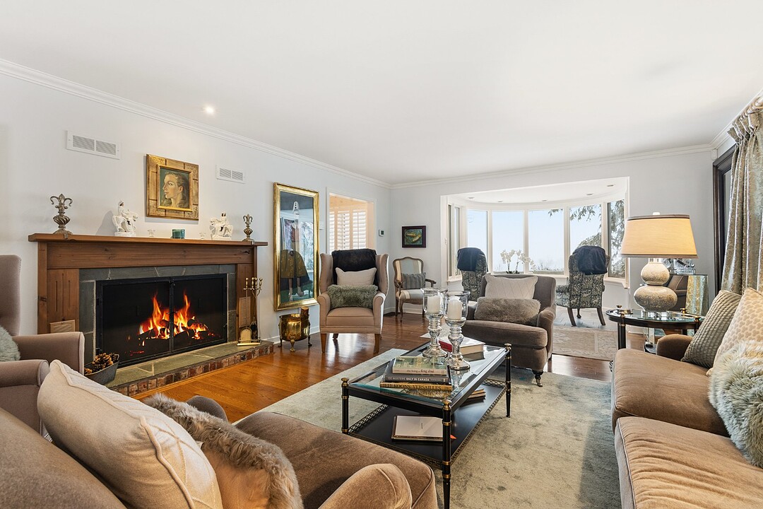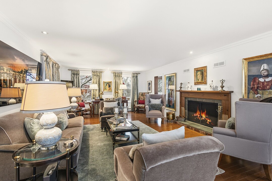 The main floor offers comfortable living and relaxation spaces, featuring several fireplaces, a bright sunroom, a fully equipped chef's kitchen, and a family room with a glassed-in nook -- a perfect setting for gathering with family or friends.