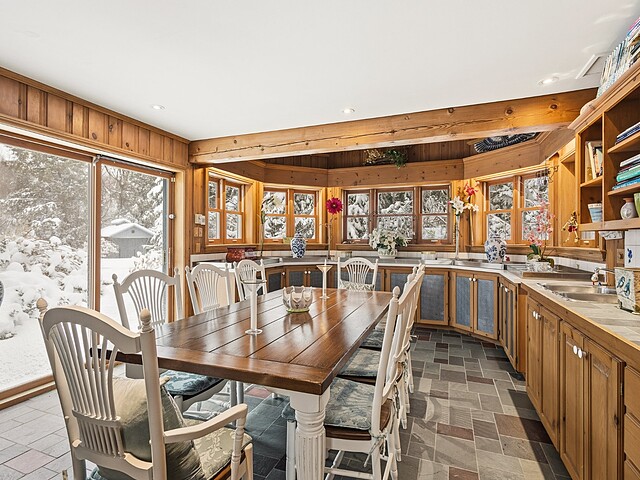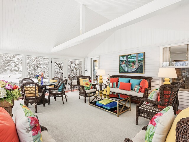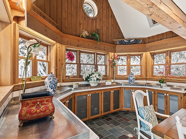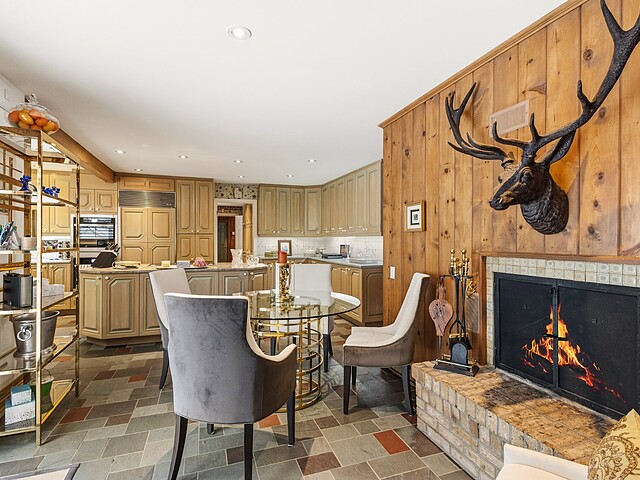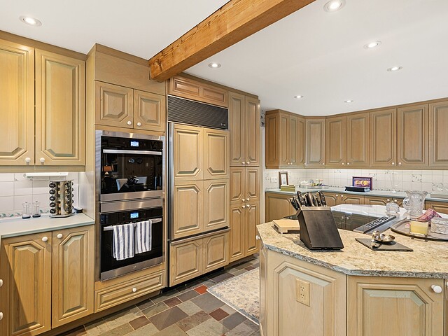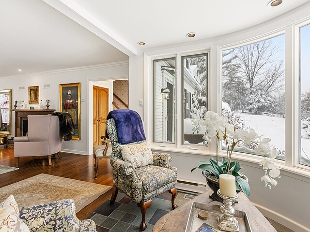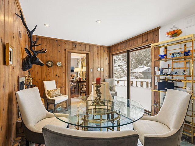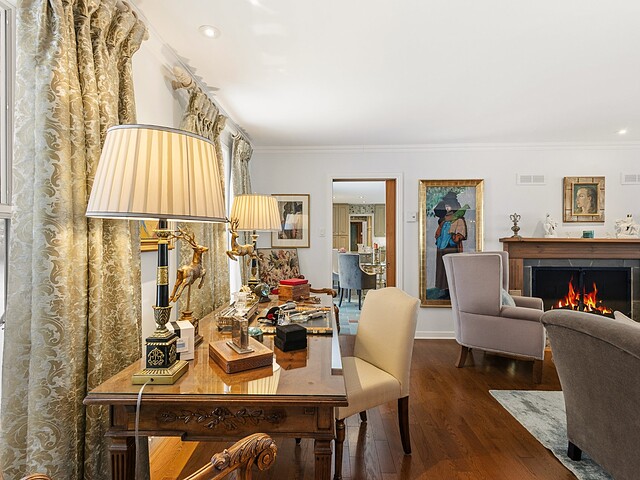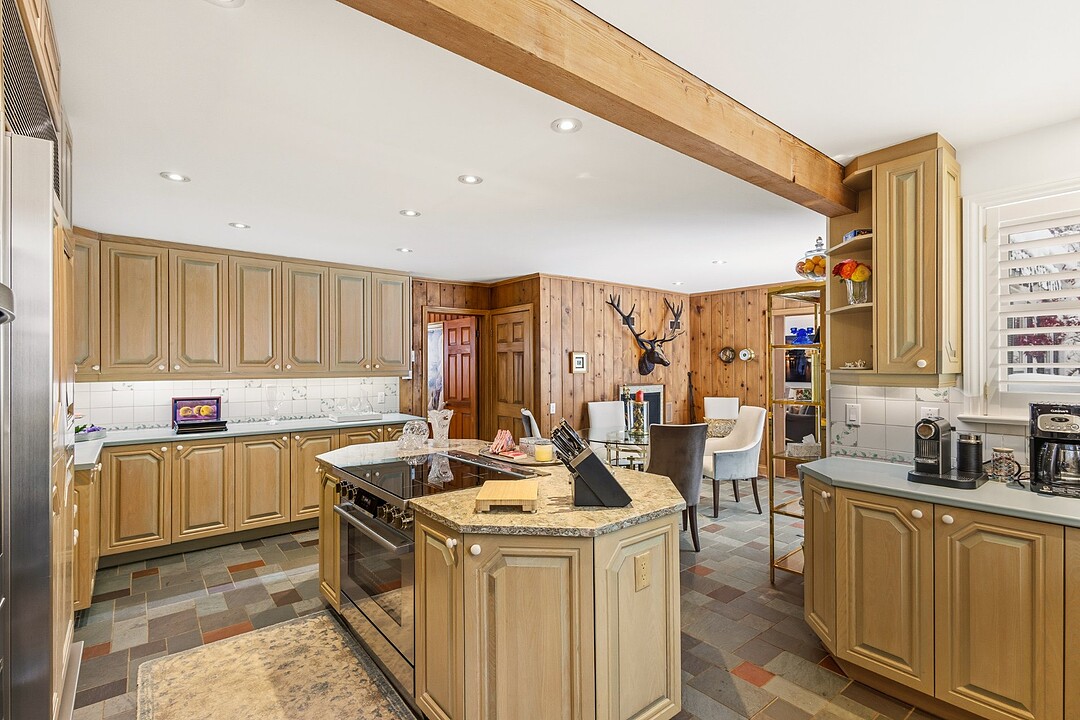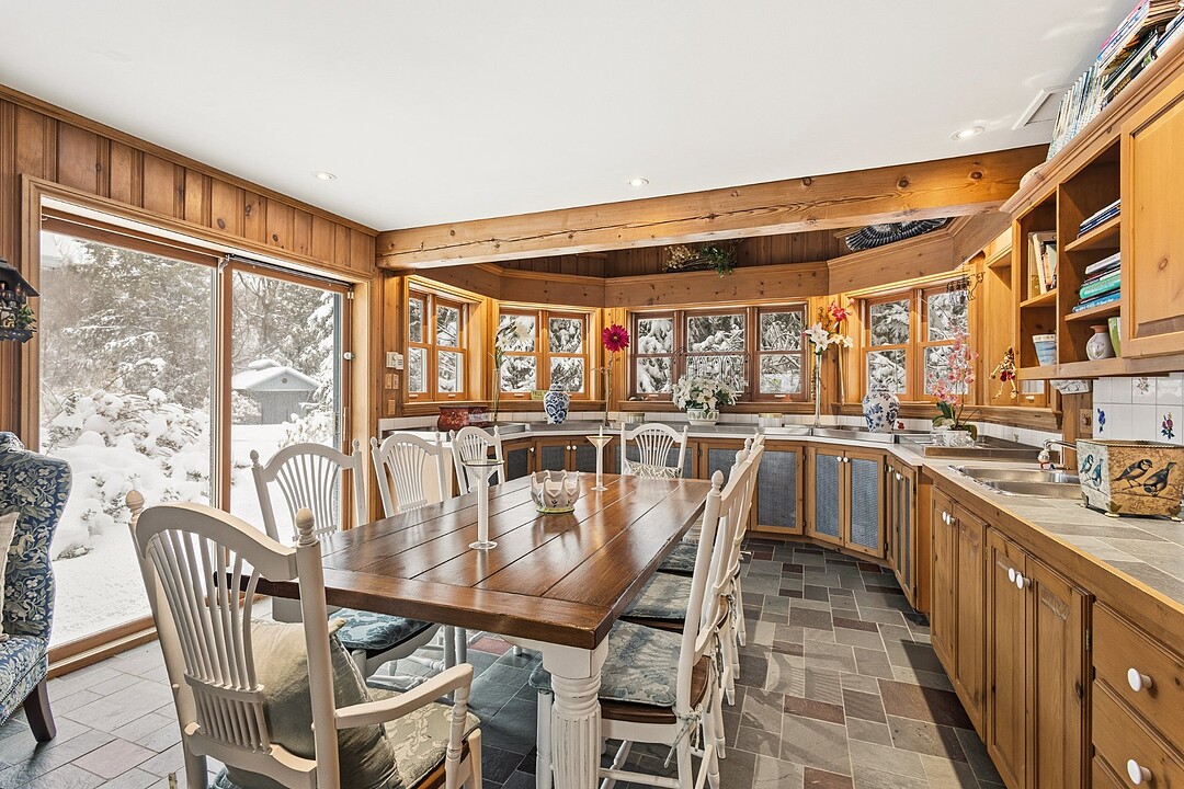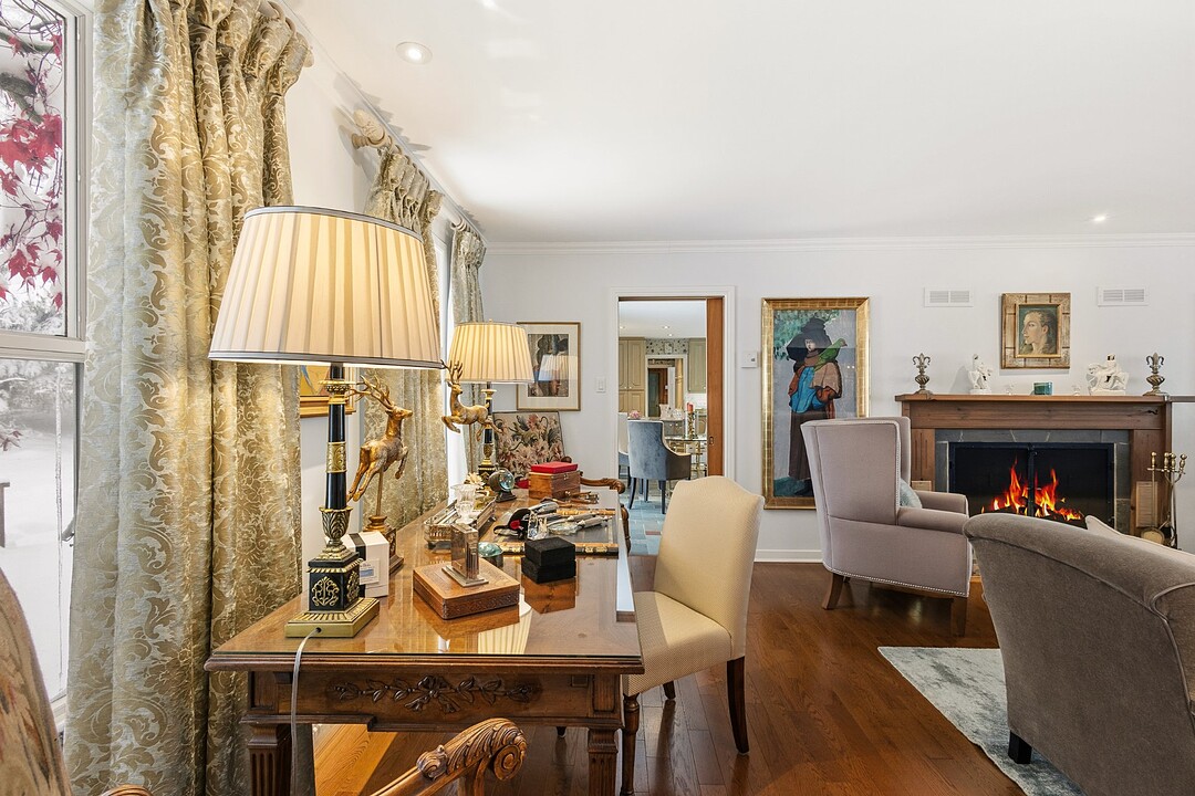 The main floor offers comfortable living and relaxation spaces, featuring several fireplaces, a bright sunroom, a fully equipped chef's kitchen, and a family room with a glassed-in nook -- a perfect setting for gathering with family or friends.