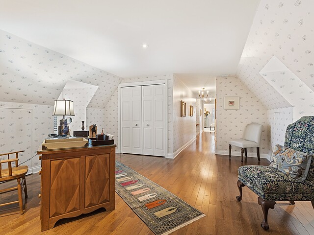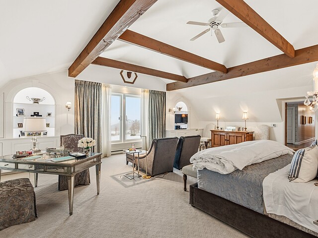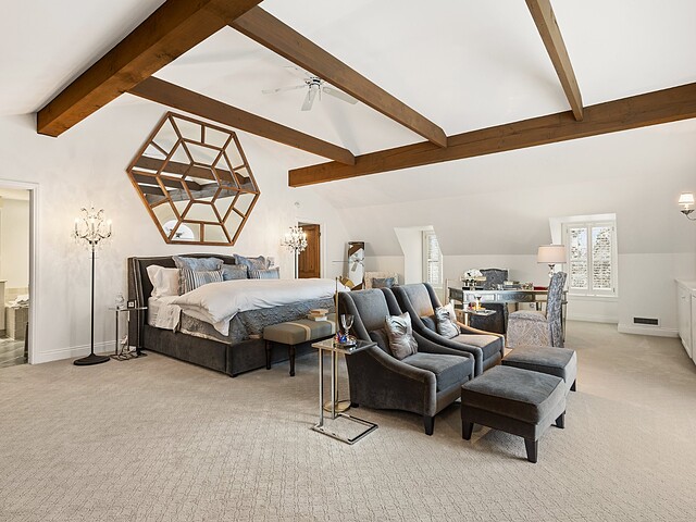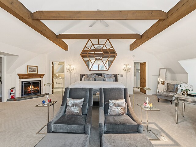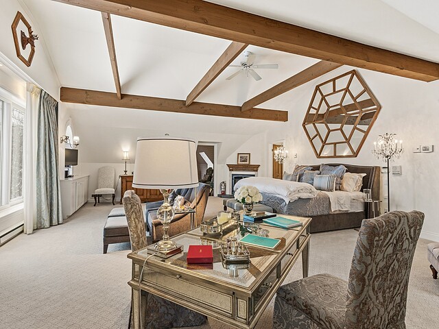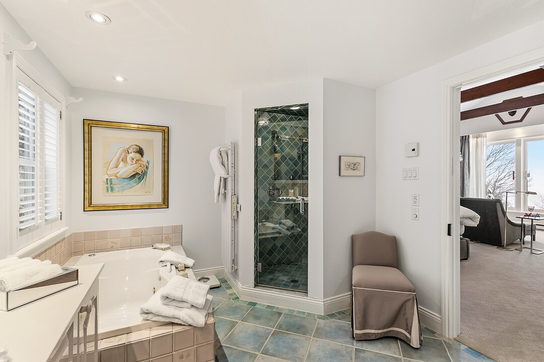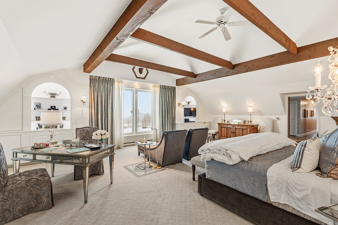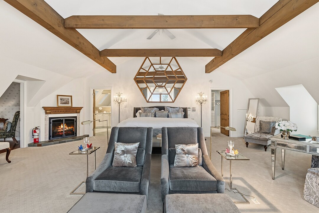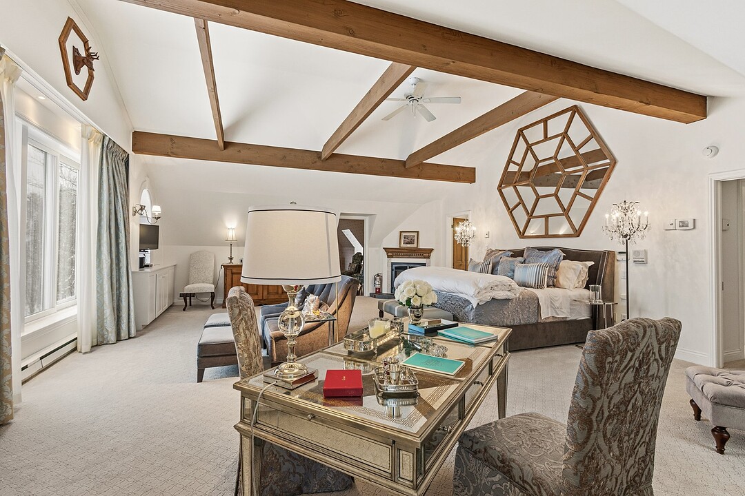 The master suite is simply incomparable, featuring an office, cathedral ceilings, a fireplace, an ensuite bathroom, a walk-in closet, and breathtaking views of the surrounding nature.