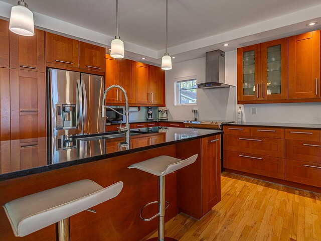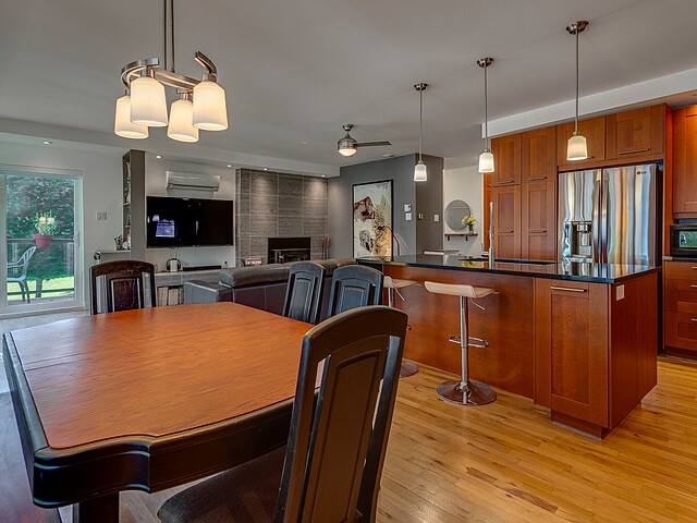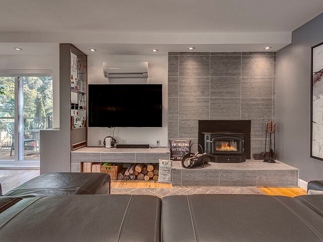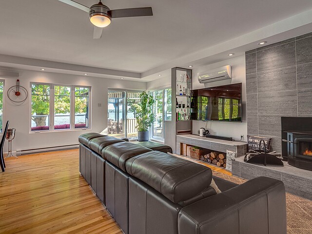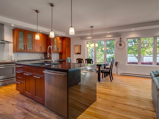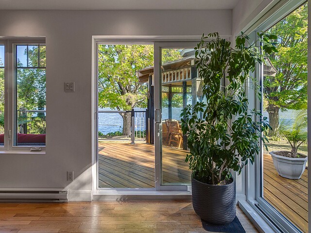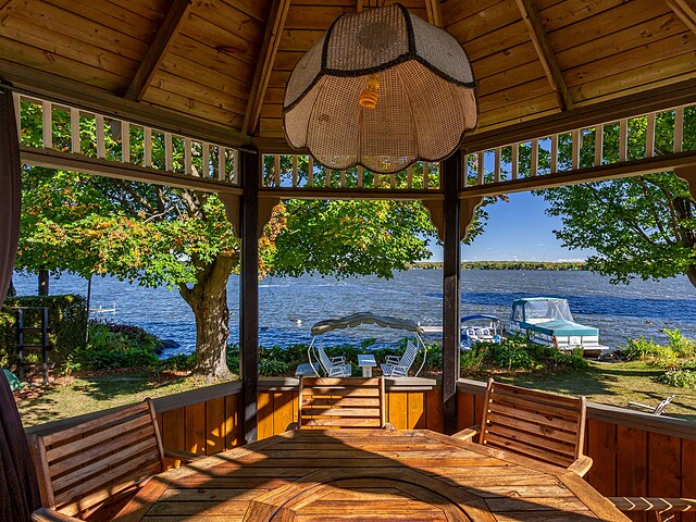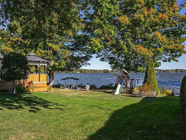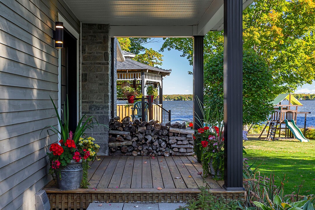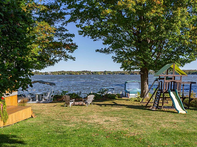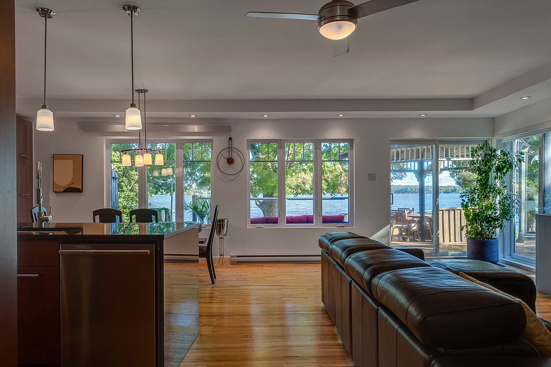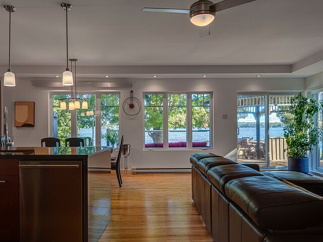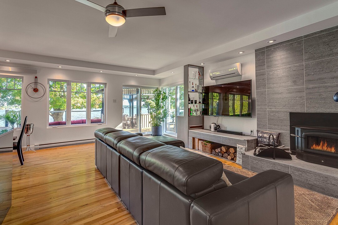 This property features spacious and bright living areas with exceptional water views. The large kitchen with a granite island opens onto a cozy living room with a wood-burning fireplace.