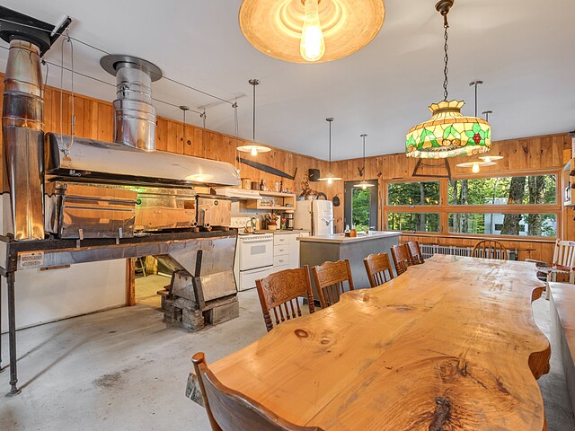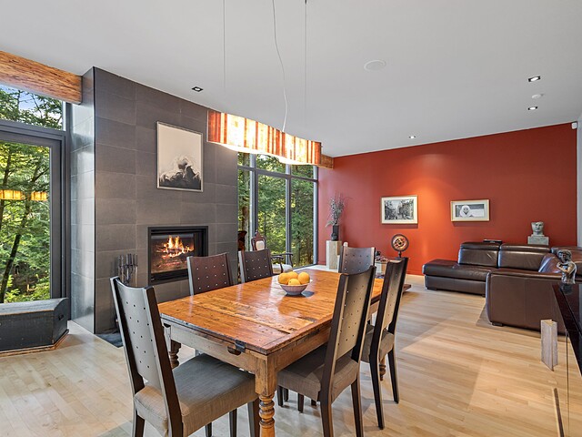 The main living area is spacious and open-concept, combining the living room, dining room, and kitchen around a warm fireplace. Oversized windows flood the space with natural light and provide access to an outdoor terrace, perfect for relaxing amidst nature.
