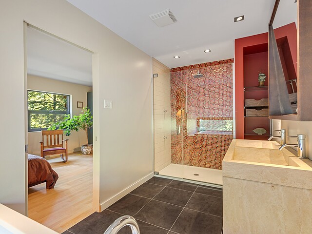 At the opposite end of the home, a bedroom and full bathroom are ideal for accommodating family or guests.