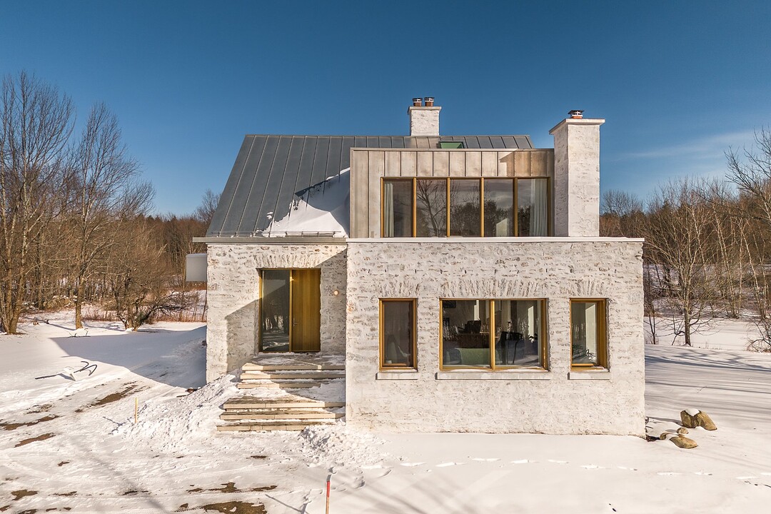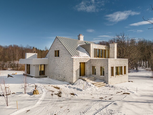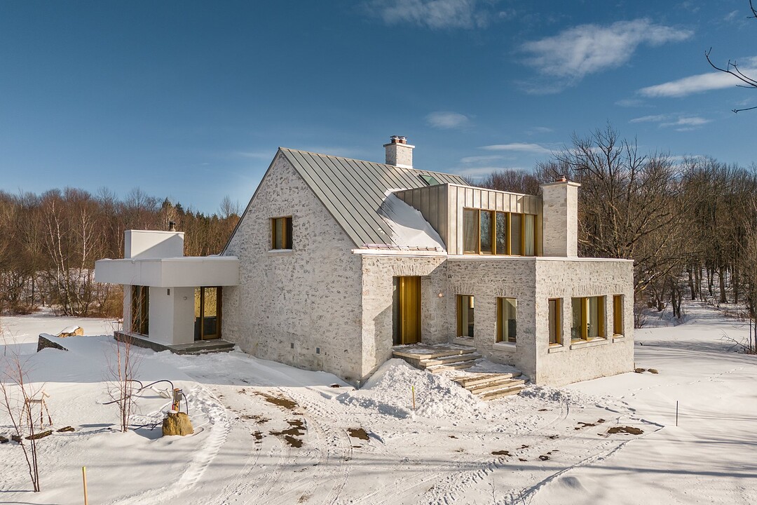 Three wood-burning fireplaces Oak kitchen Saint-Marc stone flooring Oversized interior oak doors Oversized patio doors Built-in furniture Oak and polished concrete flooring Lime paint Heated floors Central heating system Generator Wood windows Superior insulation Green roof Stone cladding and lime coating Sheet metal roof